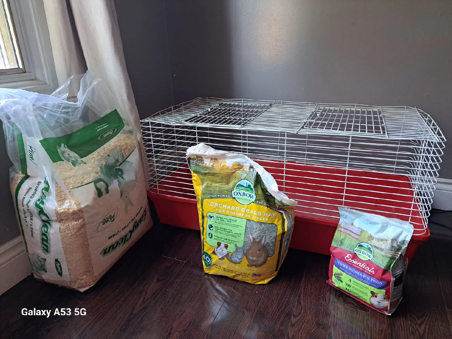 Perfect for guinea pigs, or Rabbits. 2 top doors for easy convince, includes large bag of shavings, bag of hay, a bag of young guinea pig food, and pet shampoo. Dimensions: across- 3'3" (39:) Hight- 1'6 1/4 (18 1/4") Depth- 1'8" (20")