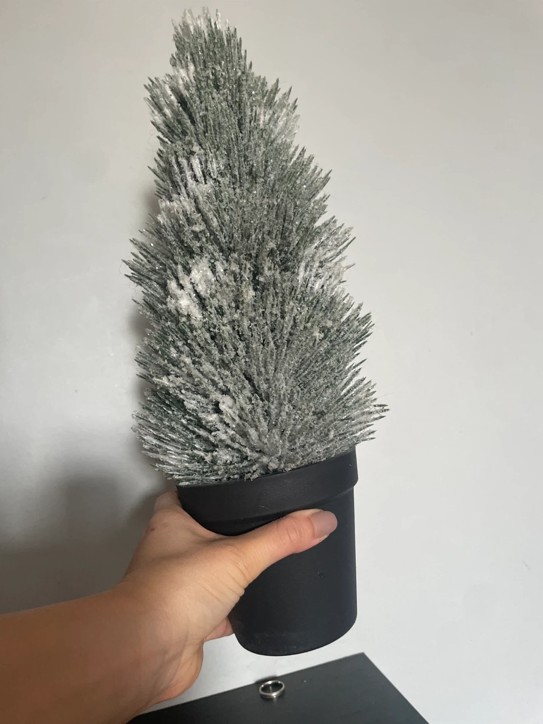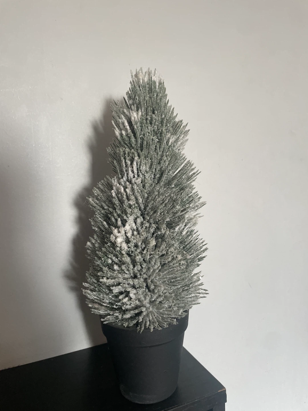 435Selling a small artificial Christmas tree that would be perfect for a desk or small space! It has a cute, frosted look and comes in a black pot