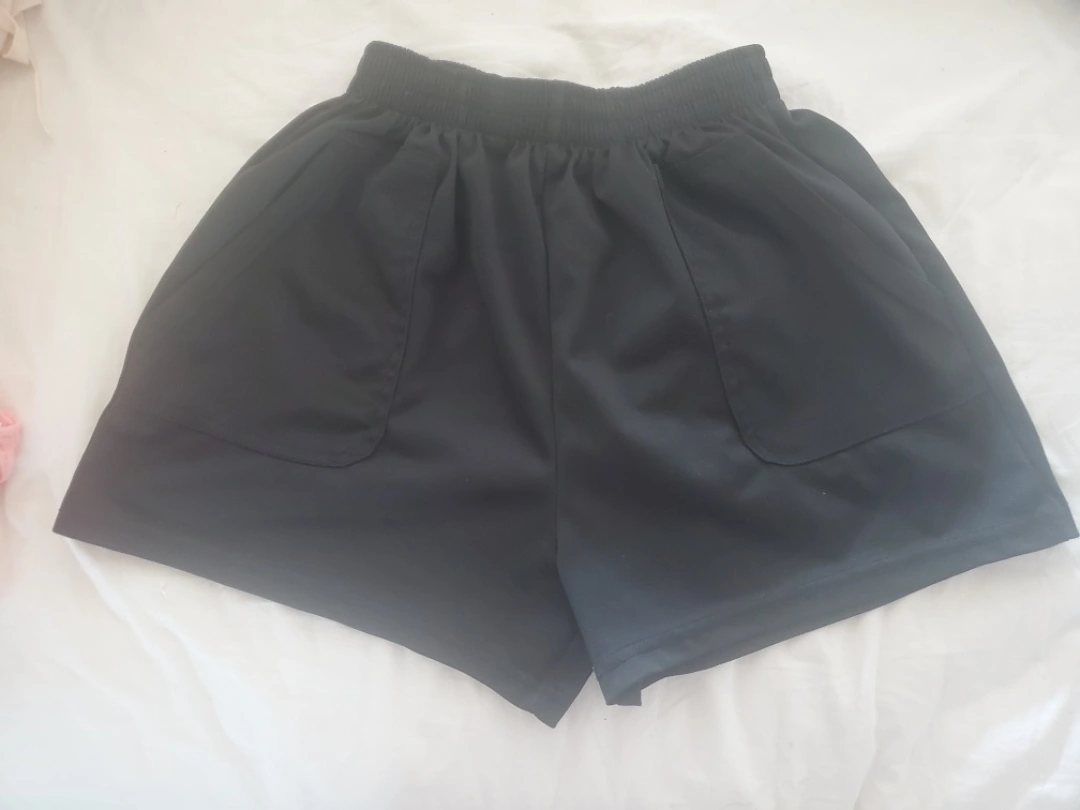 Selling a pair of black athletic shorts. They have a comfortable elastic waistband and handy pockets on each side. Perfect for workouts or just lounging around! Size is a Small.