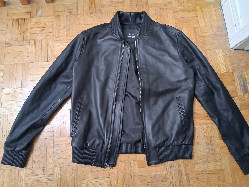 5Here's a stylish black leather bomber jacket from West Spencer! It's in great shape and ready for a new home. Perfect for adding a bit of edge to your wardrobe.