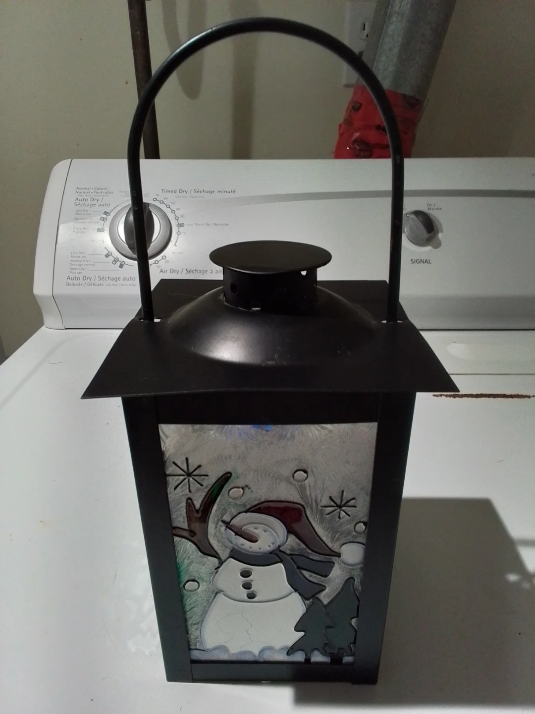 65Selling a cute black metal lantern with a snowman design on the glass. It's perfect for adding a touch of winter charm to your home decor!