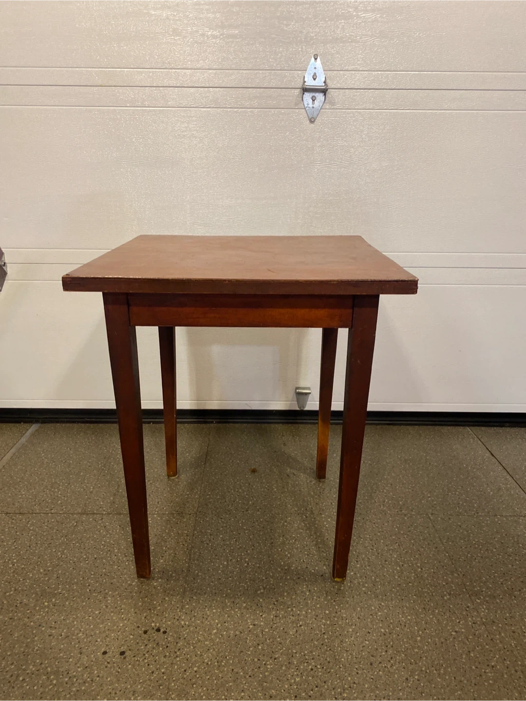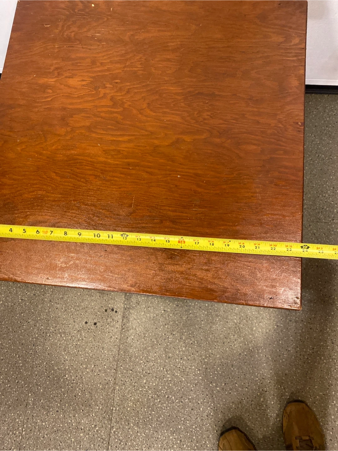 This is a small real wooden side table in a brown colour. It's perfect for a small space! The table top is approximately 23 inches long and 23 inches wide, and stands about 27 inches tall.