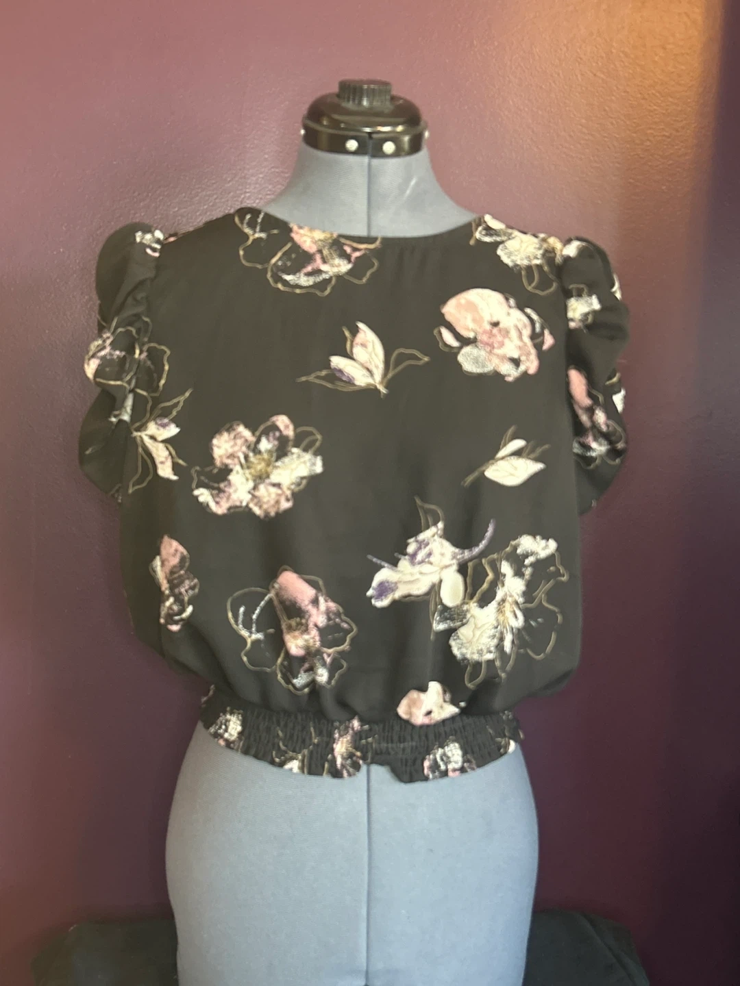293Selling a cute floral print blouse! It's dark blue with a pretty floral pattern. The blouse has short, puffed sleeves and an elastic cinched waist. It's in great condition and would be a lovely addition to your wardrobe