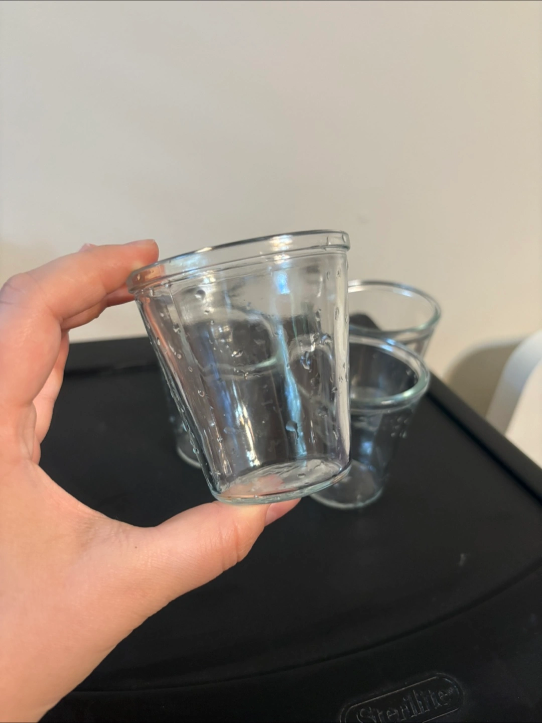 1194 small glass jars. Perfect for candle making or desserts. I just washed them, ignore the water drops :) Pick up only.