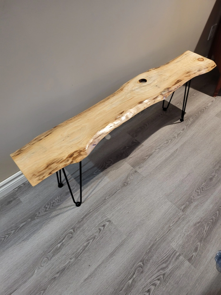 Selling a unique, handmade live edge coffee table! It's made from a beautiful piece of wood with metal hairpin legs. The bench is approximately 55 inches long and 10 inches wide. It would make a great addition to any home!