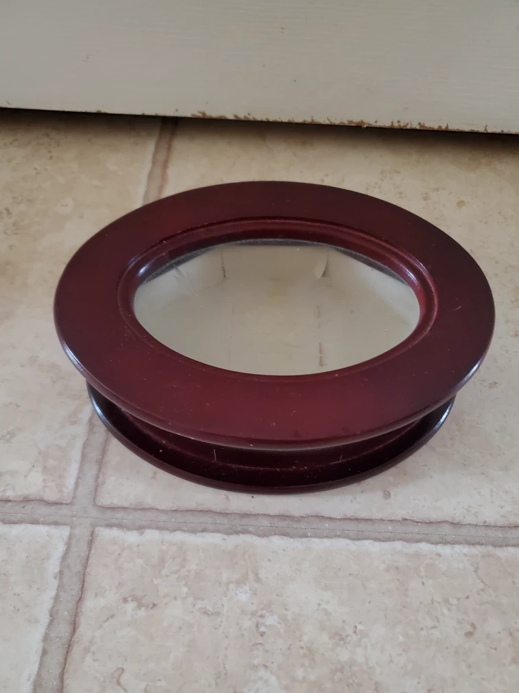 453Selling a burgundy-coloured ring holder with a mirror in the centre. It's perfect for storing your favourite rings and keeping them organized. The mirror adds a nice touch for checking your jewelry before heading out!
