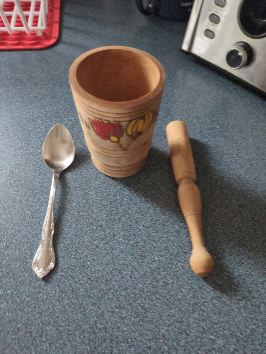 Selling a small wooden mortar and pestle set! (teaspoon shown for reference)It's in great shape and perfect for grinding herbs and spices. Includes a spoon for easy scooping. Ready to find a new home in your kitchen!