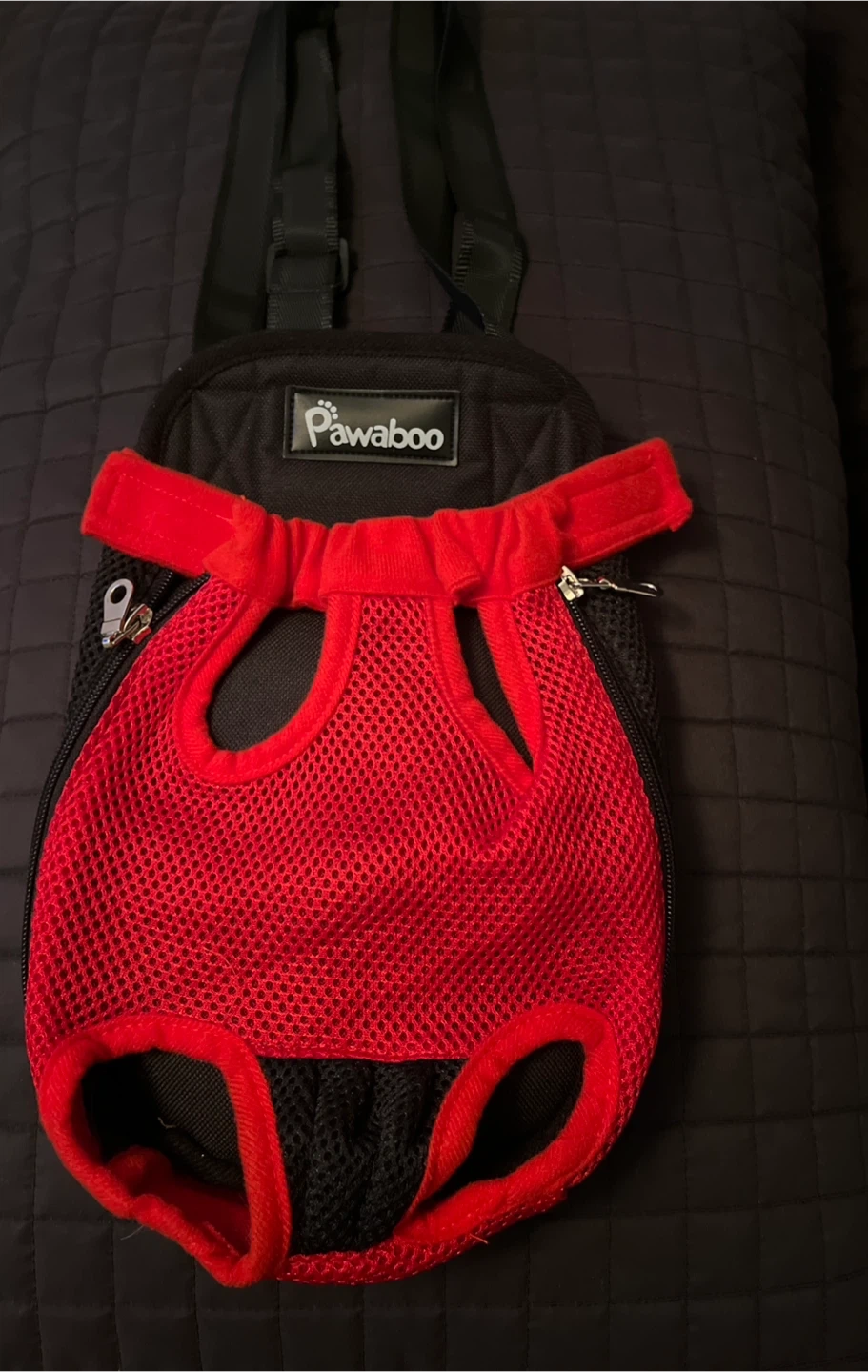 10Check out this Pawaboo pet carrier sling! It's in great shape and ready for your furry friend. The carrier is black with red mesh, perfect for keeping your pet secure and comfy on walks or errands