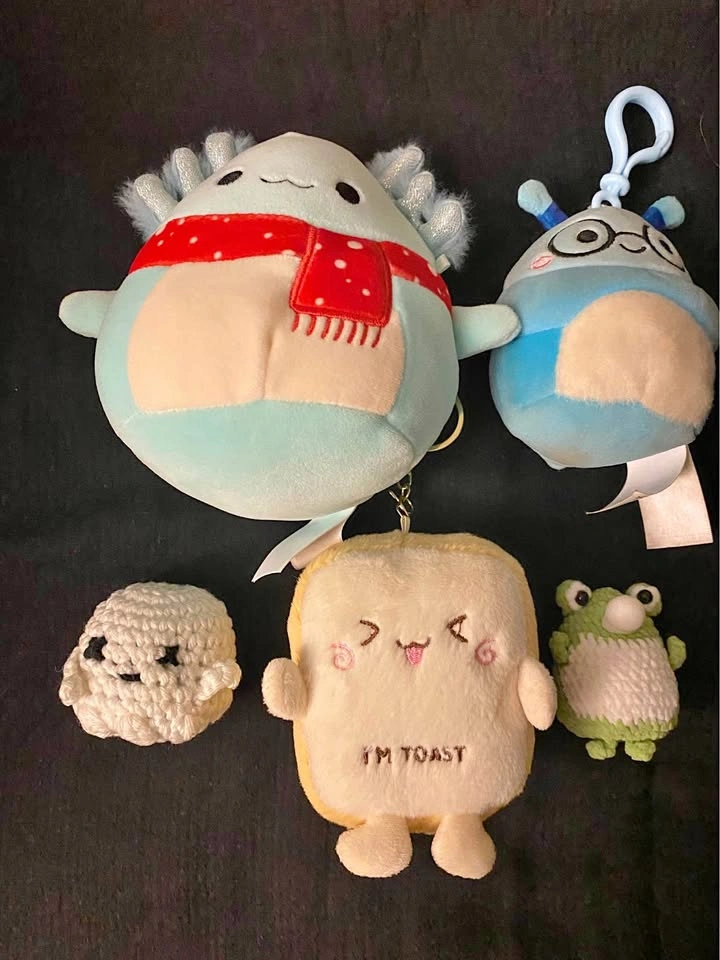 15CAD 13 if bought in a set of 5 as in first picture, see below for separate pricing. Contains: - 2 X tiny crotchet toys - CAD 2 each - 2 X small (size of a big palm) plush toys with key chain/hook - CAD 4 each - 1 X regular plushy (size of a hand) - CAD 6 No tears or stains, looks same as in picture.