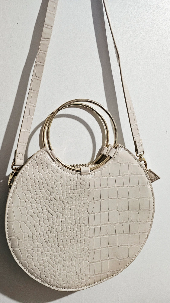 This is a cute round crossbody bag with a croc-embossed texture. It's a light beige colour and features gold-tone hardware, including the circular handles. Perfect for adding a stylish touch to any outfit!
