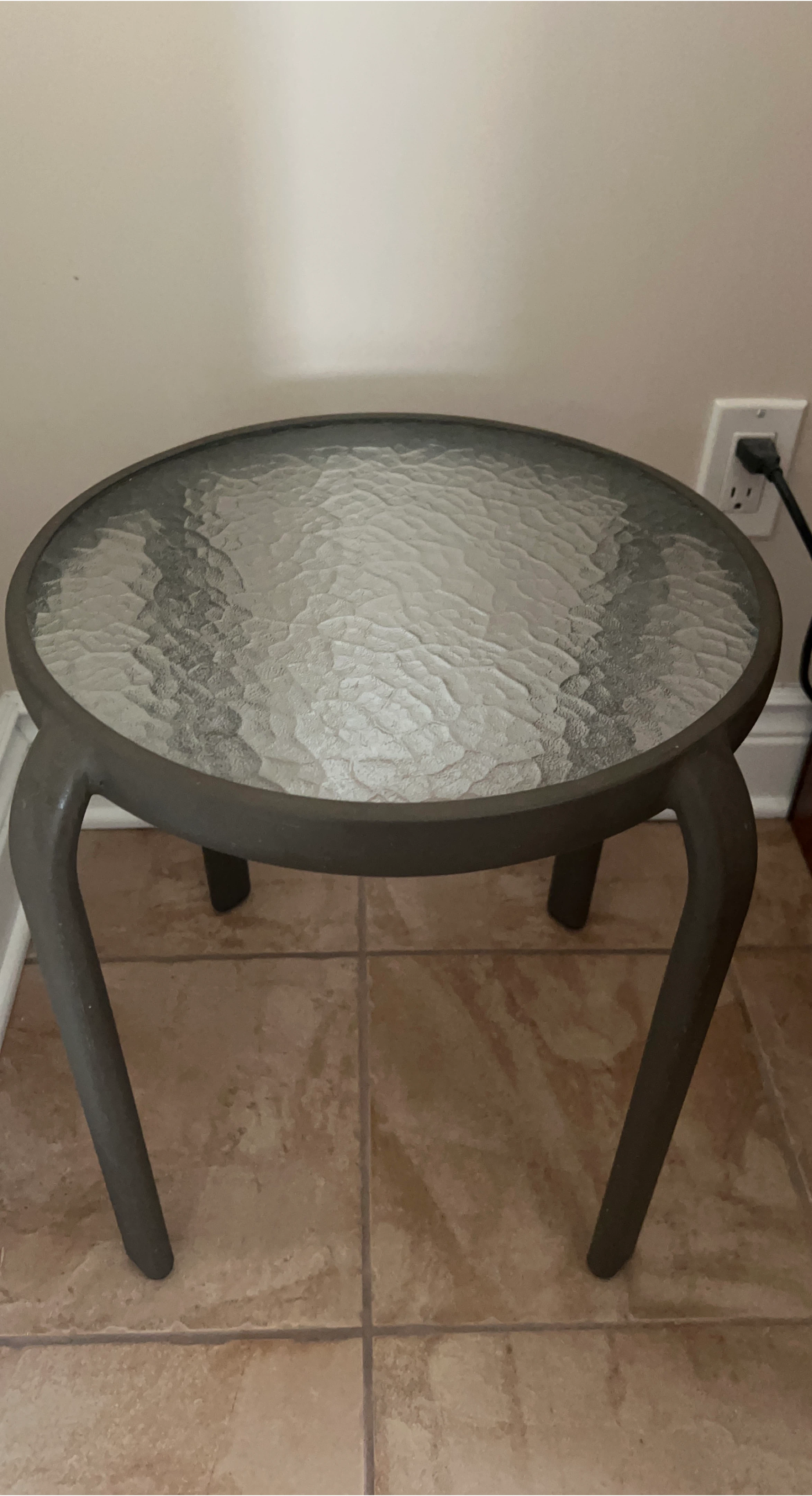 Selling a small, round table with a glass top. It has a simple design and is perfect for a small space or as a side table. The frame appears to be a dark grey or brown. It's in good condition and ready for a new home!