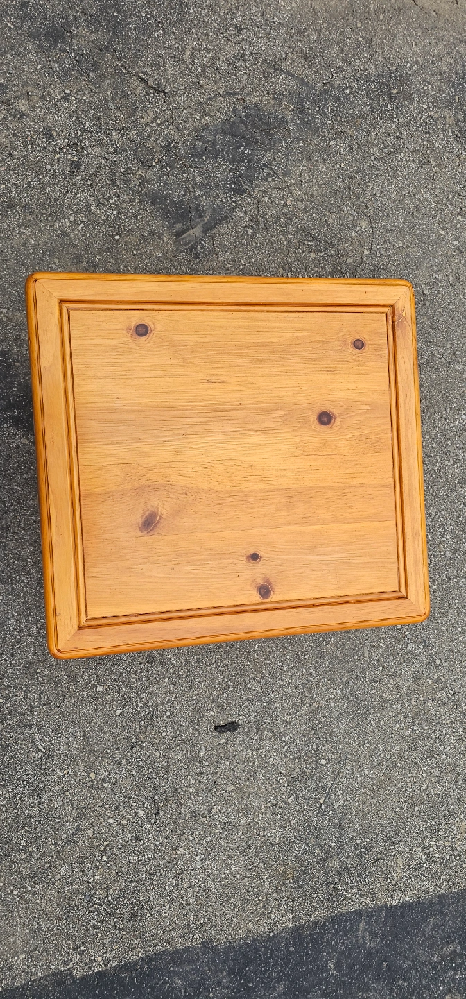 21Selling a small side table with a wooden top and black metal legs. It's perfect for a small space or as an accent piece in any room. The table is in good condition and ready for a new home!