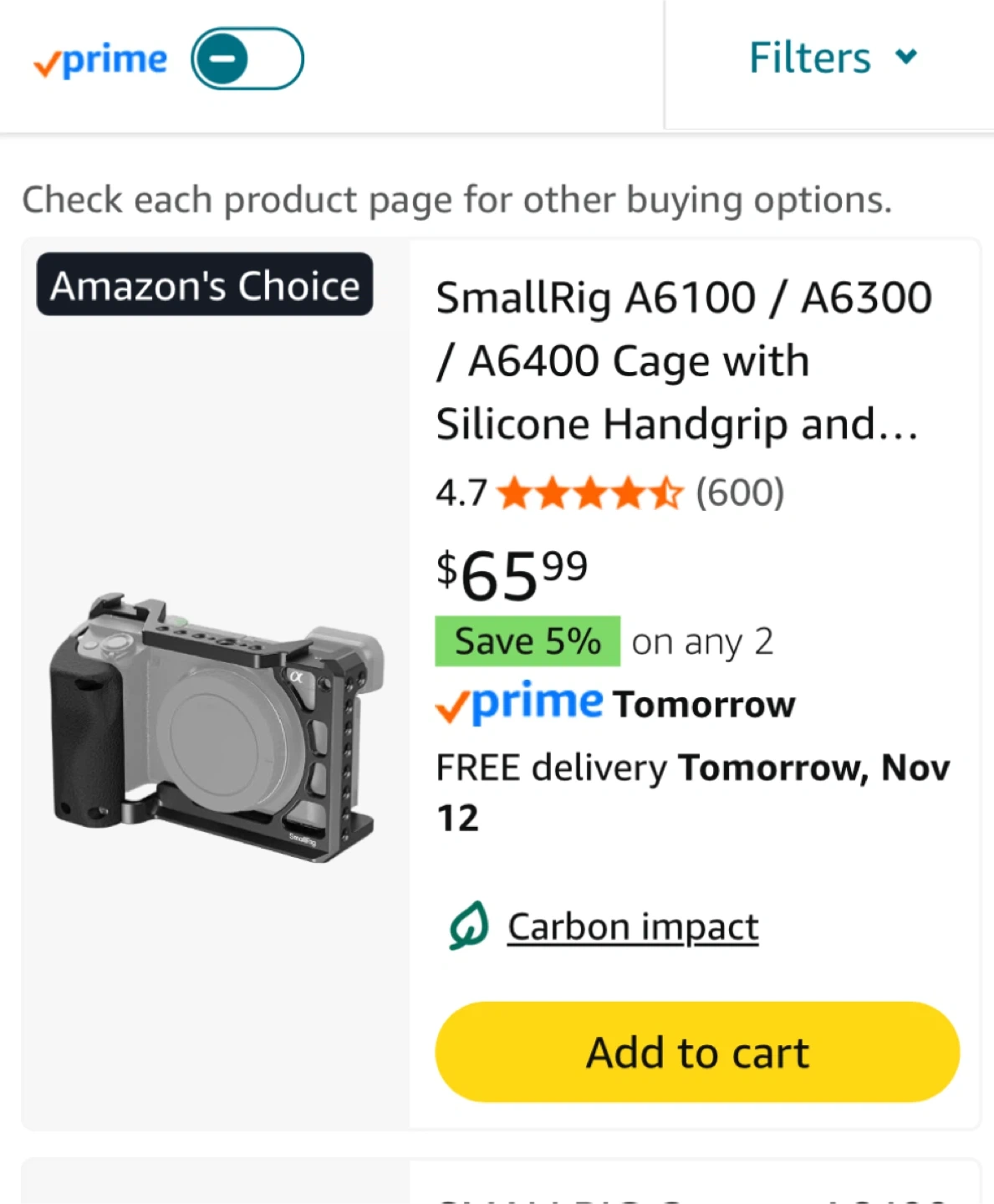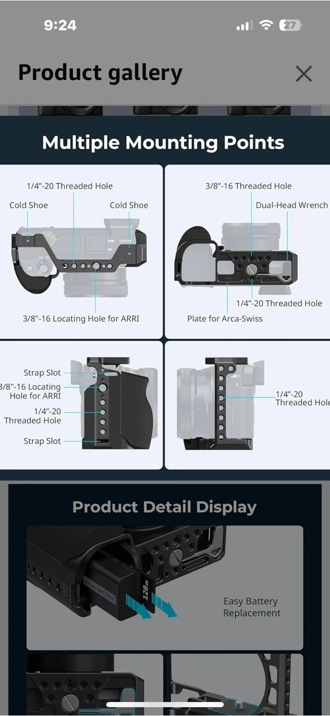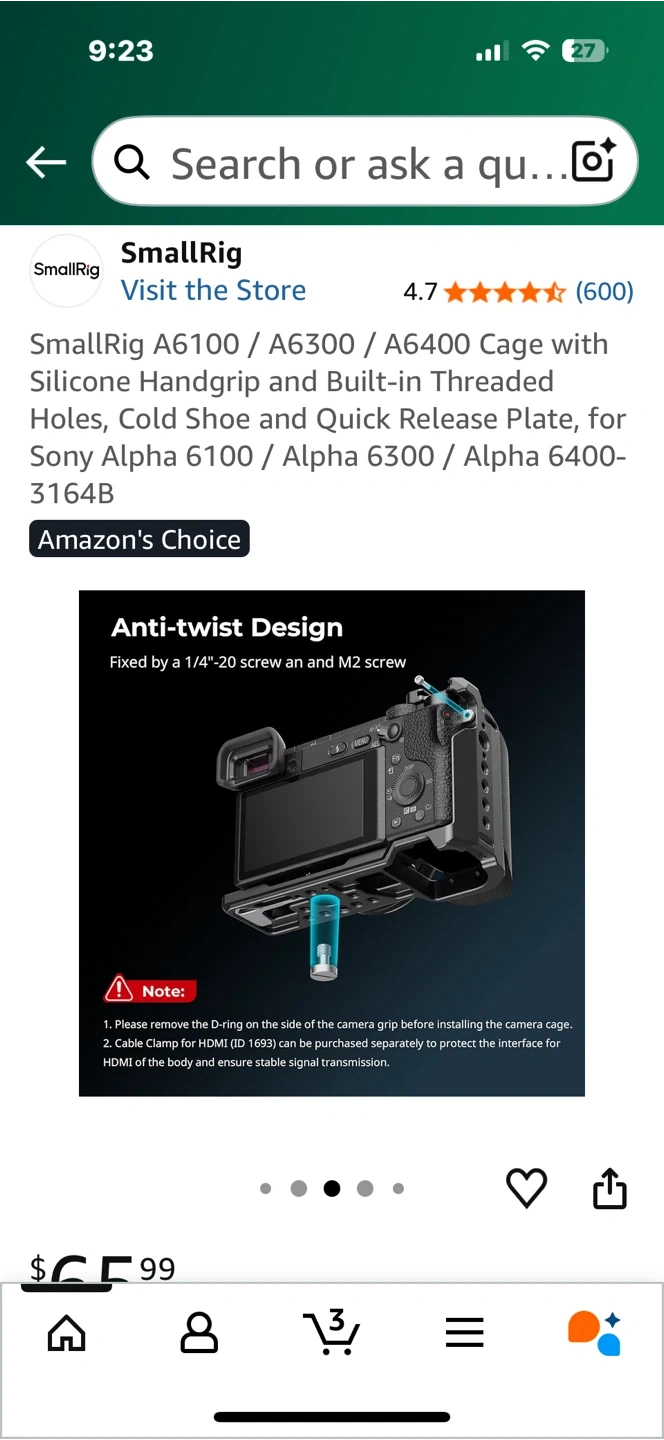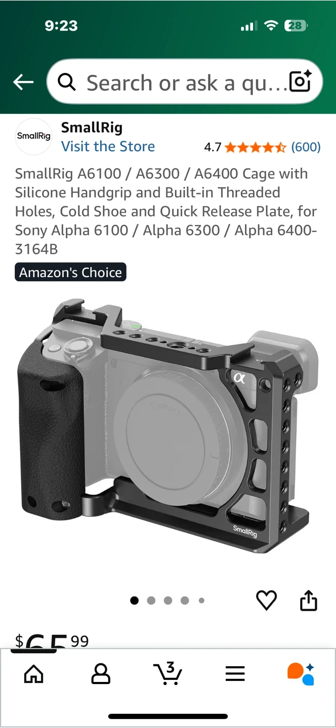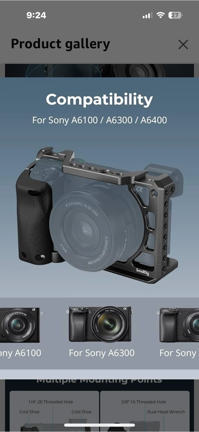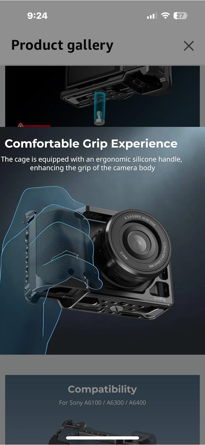 Selling a SmallRig camera cage designed for Sony Alpha A6100, A6300, and A6400 cameras! It features a comfortable grip with an ergonomic silicone handle, enhancing the camera body's grip. It also has multiple mounting points.