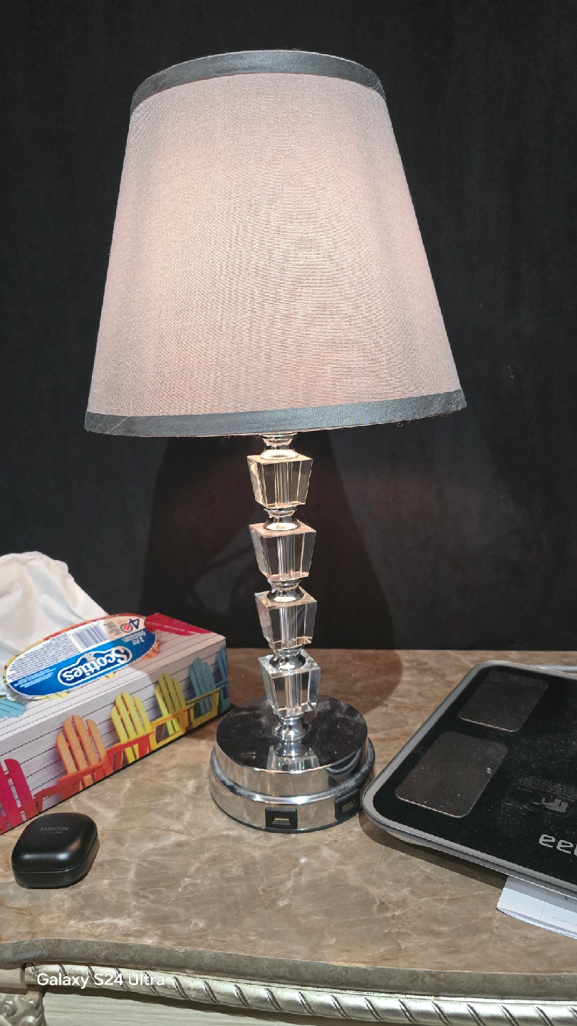 Selling a lovely crystal table lamp! It has a grey shade and a stylish design that would look great in any room. 3 smart lighting setting with touch & output charger for phones