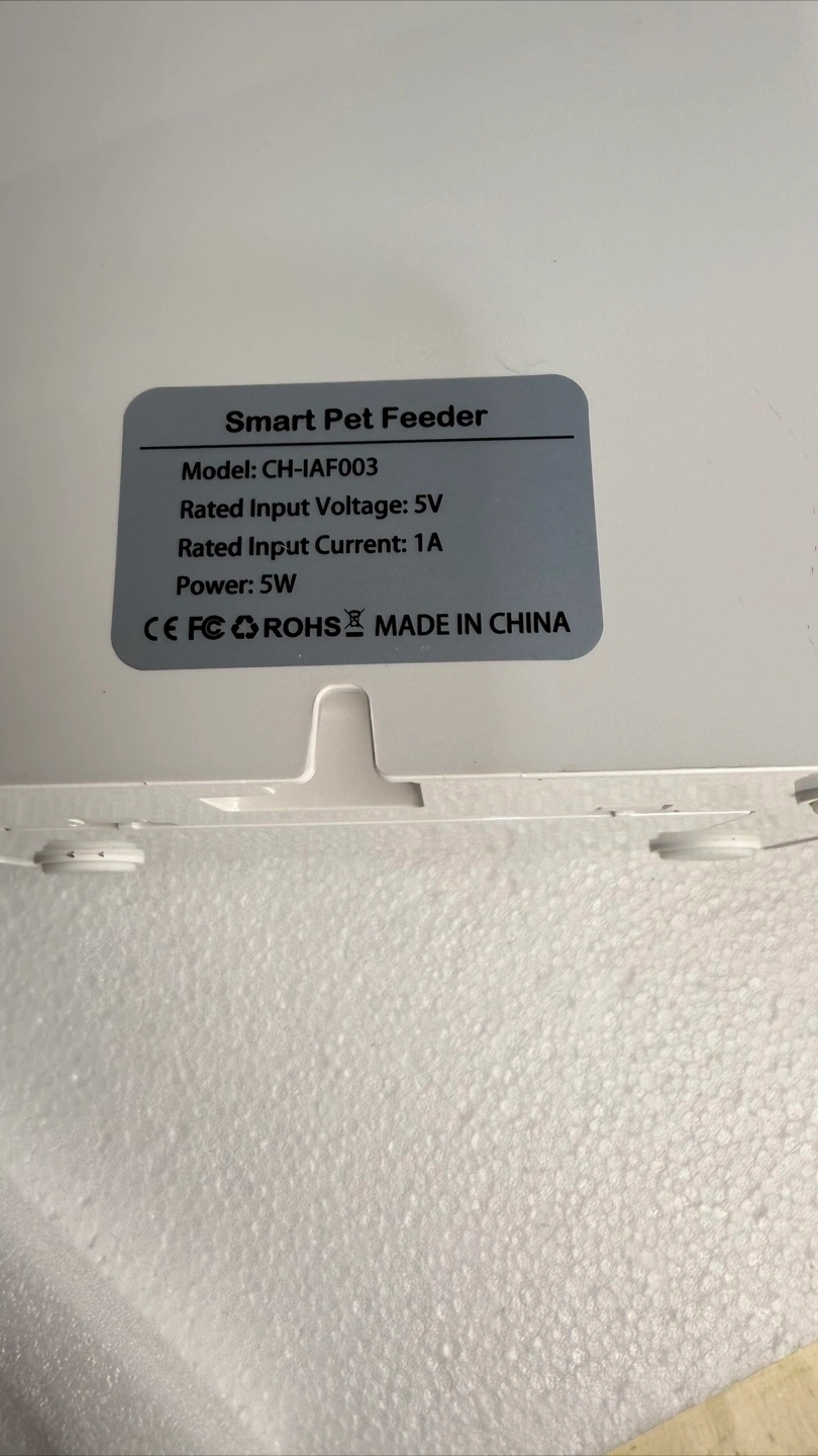 Selling a smart pet feeder, model CH-IAF003. It's in great condition and ready to help you keep your furry friend fed on schedule! It requires a rated input voltage of 5V and a rated input current of 1A, with a power of 5W ❗️ Bowl and charging cable are not included