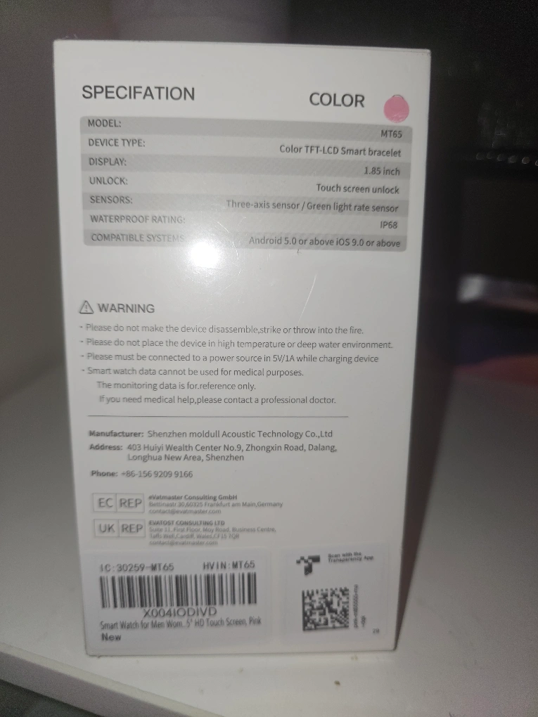 10Selling a brand new Smart Watch. For Android phones only. It's still in the box and has never been used. $40 FIRM Key Features: - 1.85 inch Color TFT-LCD Smart bracelet display - Touch screen unlock - Three-axis sensor / Green light rate sensor - Waterproof rating: IP68 - Compatible with Android 5.0 or above, or iOS 9.0 or above