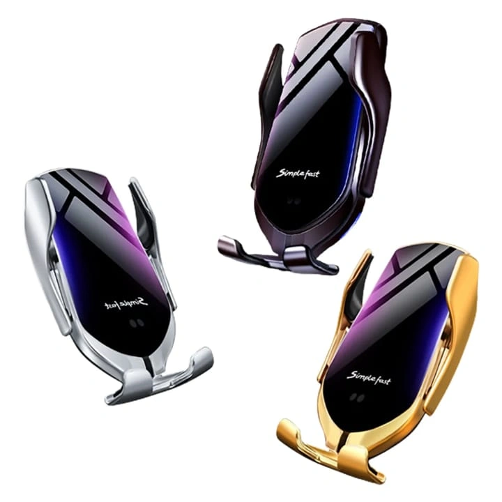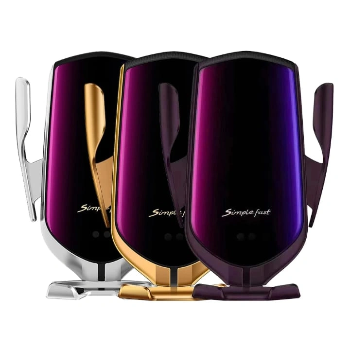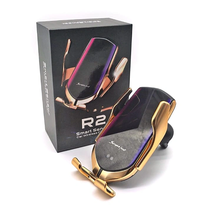 The R2 Smart Sensor Car Phone Holder offers fast wireless charging with automatic clamping, compatible with QC fast charging for supported devices. It features multiple safety protections including overcurrent, overvoltage, and short circuit protection, ensuring secure and efficient charging. Available in Gold, Silver, and Black, it is made from PC+ABS fireproof material, providing durability and a sleek design.