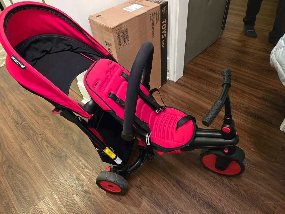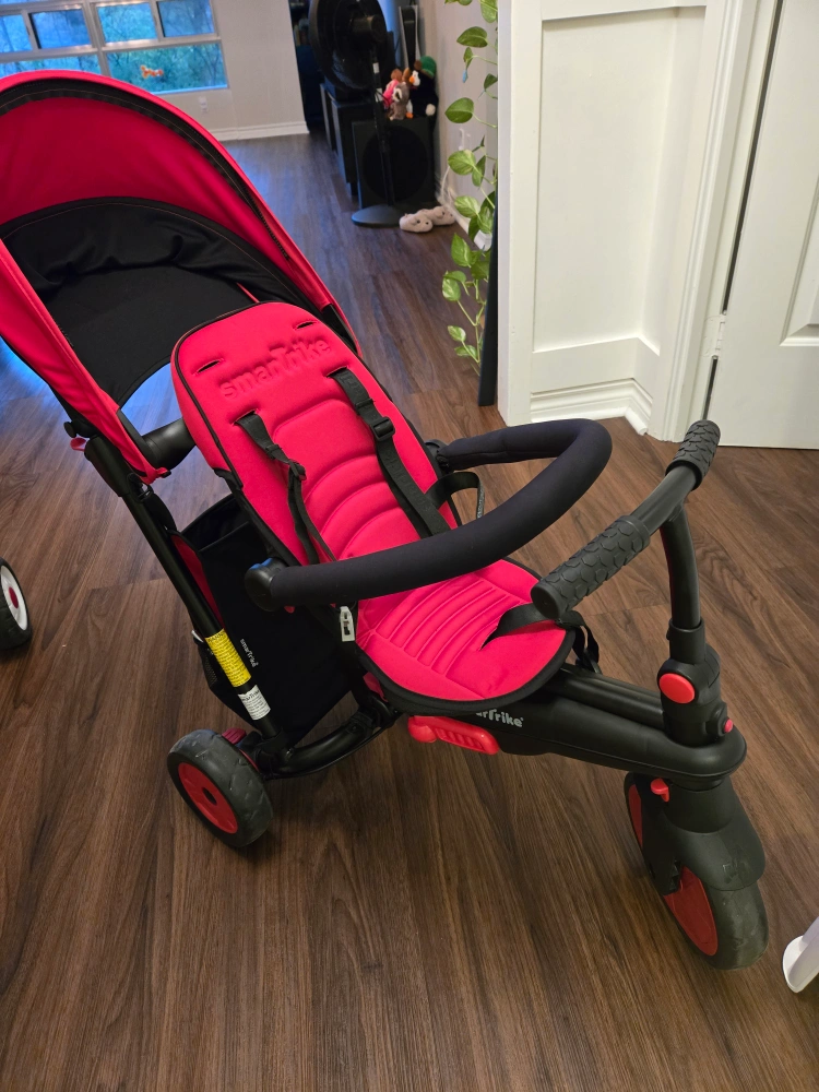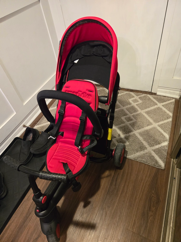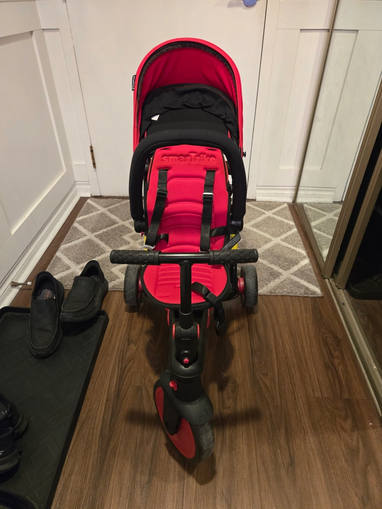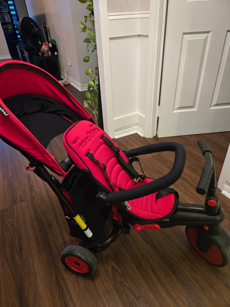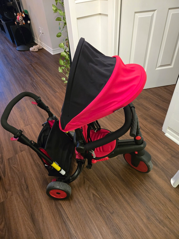 Red tricycle with a canopy, parent handle, and storage basket. Converts to a regular tricycle. used once indoors