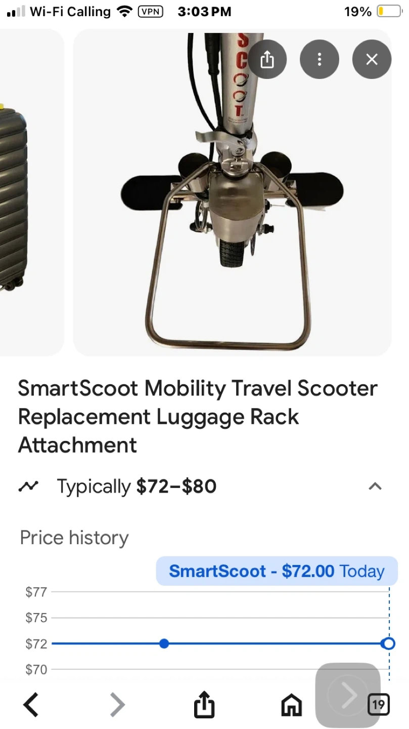 Selling a SmartScoot mobility travel scooter. It comes with a luggage rack attachment and a front handlebar wire basket. Also includes a battery charger. Great for getting around! If you’re planning a cruise, it’s an absolute necessity. You can drive the scooter directly to the plane it folds up they will put it under the plane until you arrive at your destination. has a range of 12 miles has three speeds from 3 mph to 7 mph. It can fold up to fit in the trunk of any automobile. Asking $450.