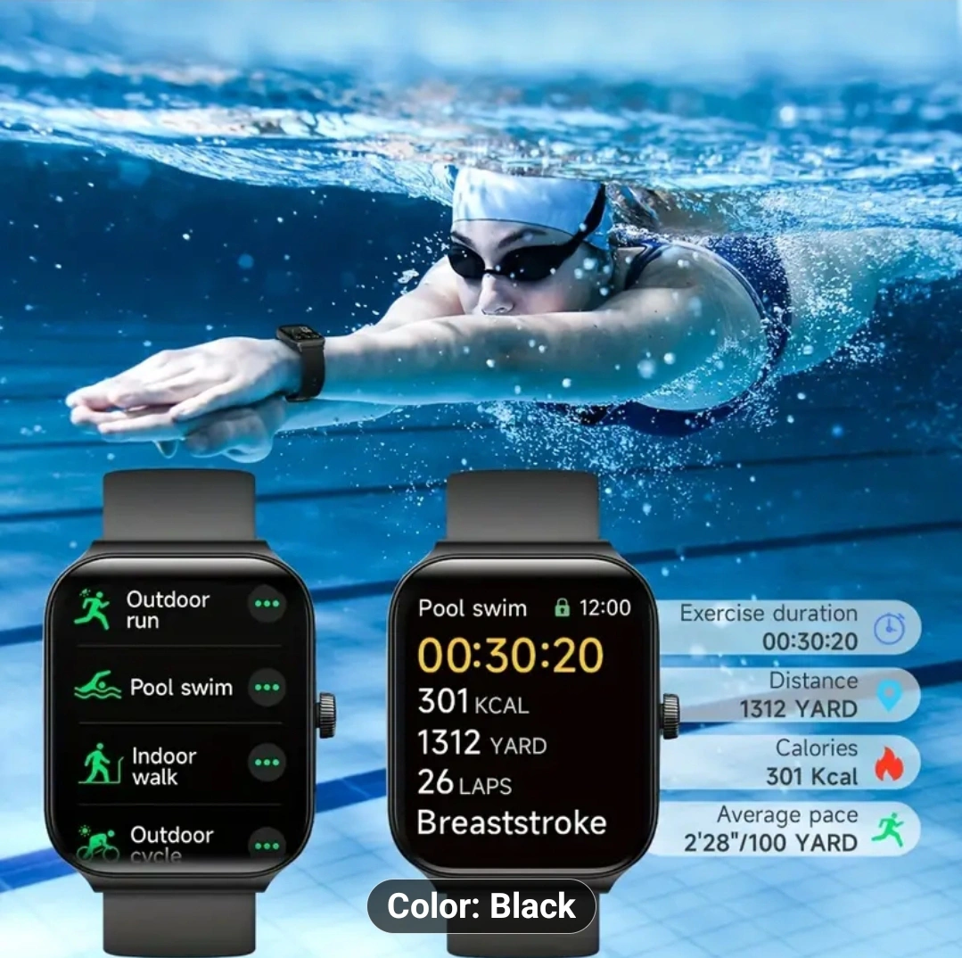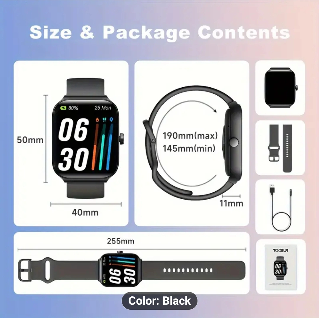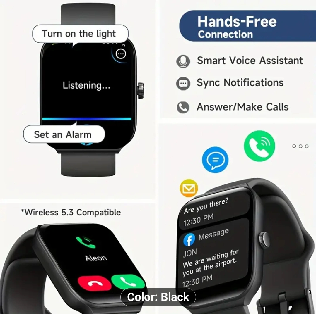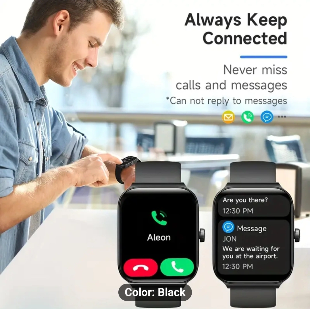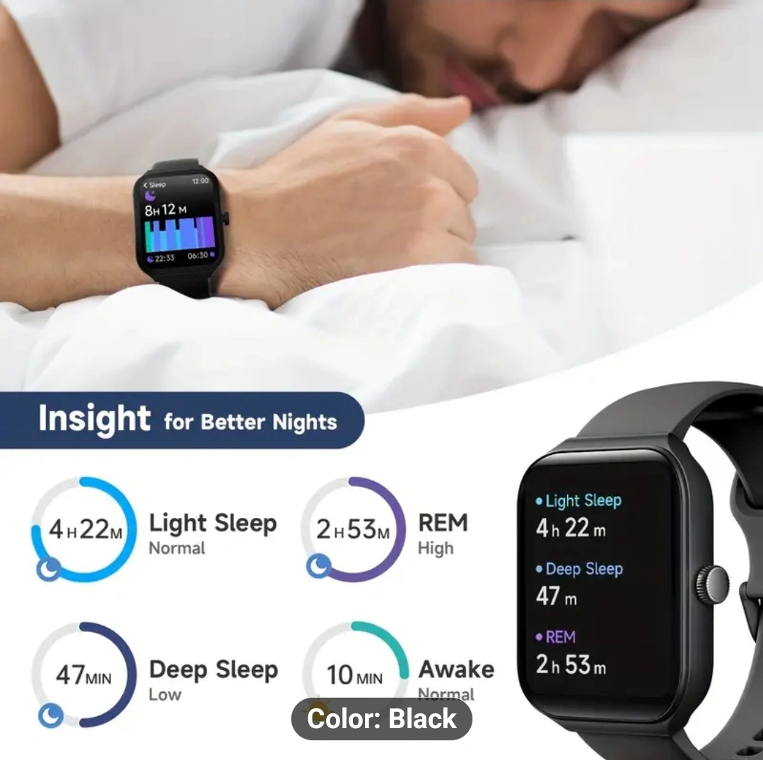 Black smartwatch. Features sleep tracking, message and call notifications. A great way to keep you connected and informed throughout your day.
