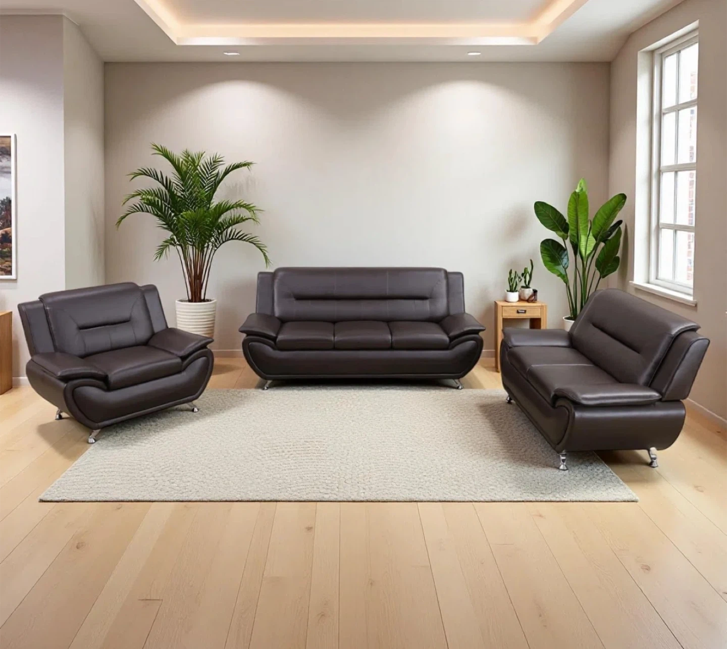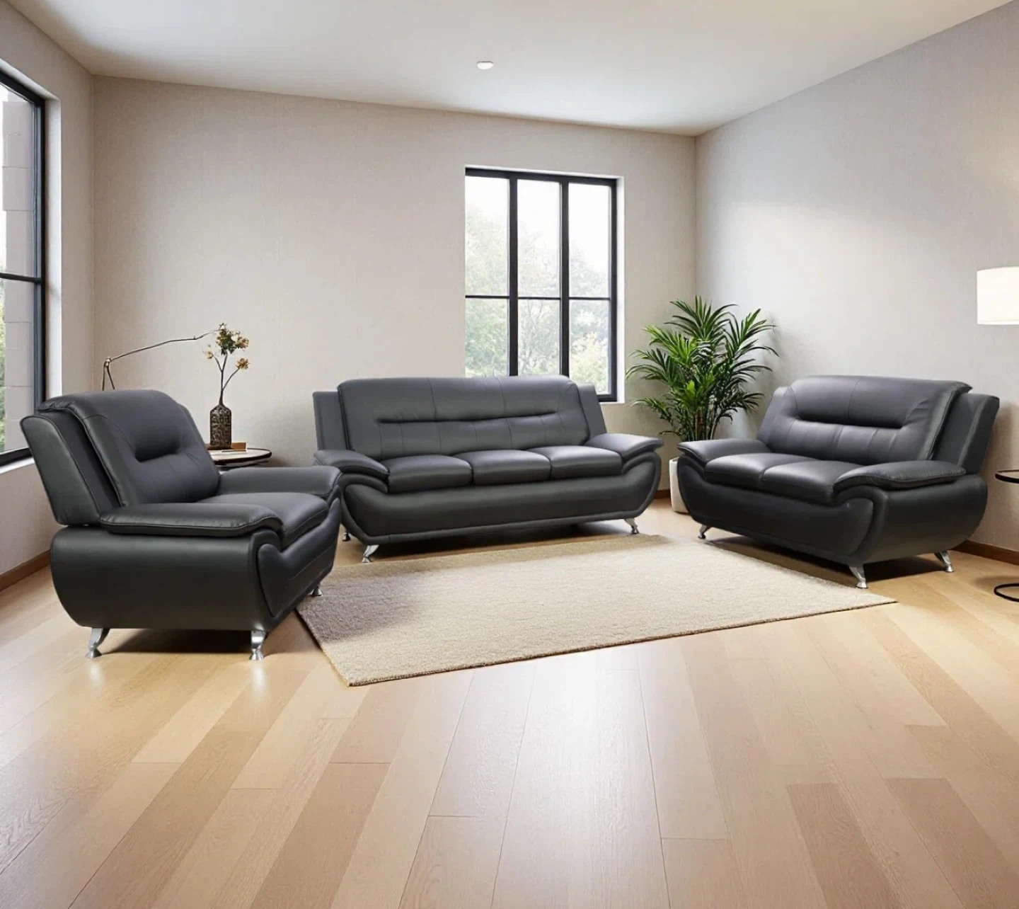 Three-piece sofa set including a loveseat, sofa, and armchair. Upholstered in a smooth, durable leather. Modern design with chrome legs.