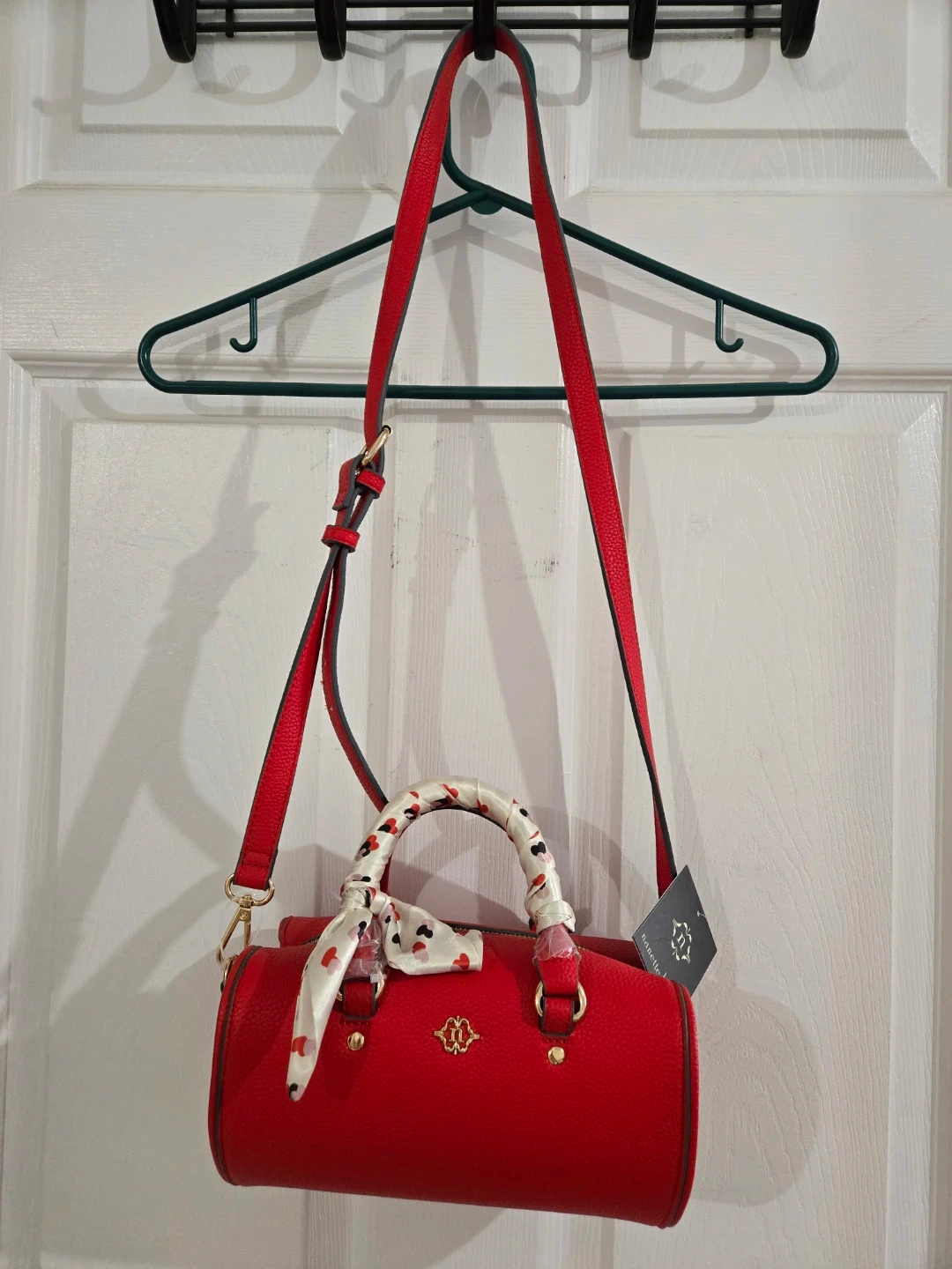 This is a red barrel handbag by Nanette Lepore. It features a decorative scarf tied around the handle. The bag has a removable shoulder strap and gold-tone hardware.
