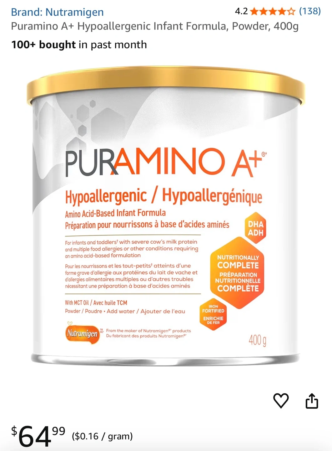 Two cans of PurAmino A+ hypoallergenic, amino acid-based infant formula. Each can contains 400g powder. Nuttergen formula.expires February 2027