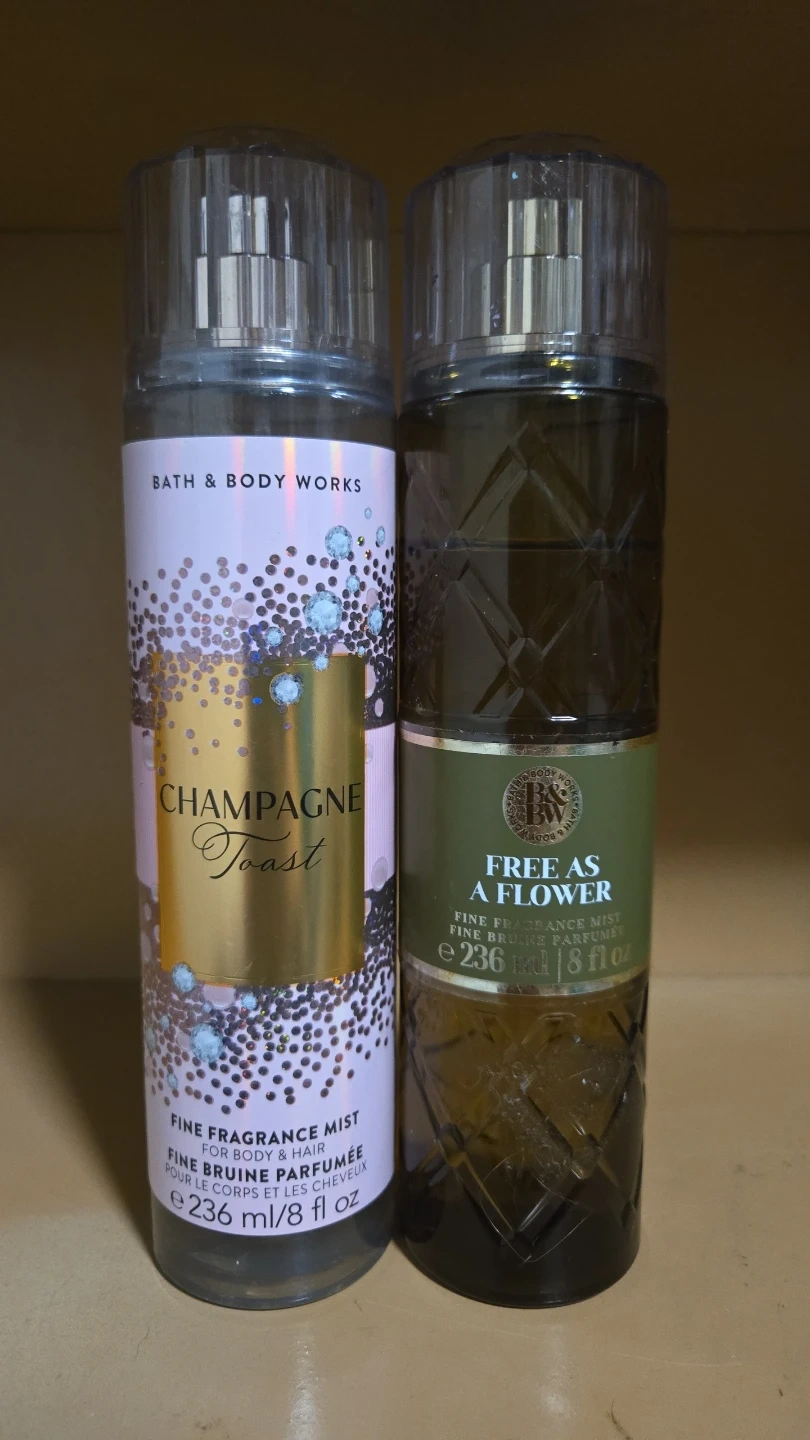 Two 8 fl oz bottles of Bath & Body Works fine fragrance mist. Includes "Champagne Toast" and "Free as a Flower" scents. Both bottles are 236 ml.