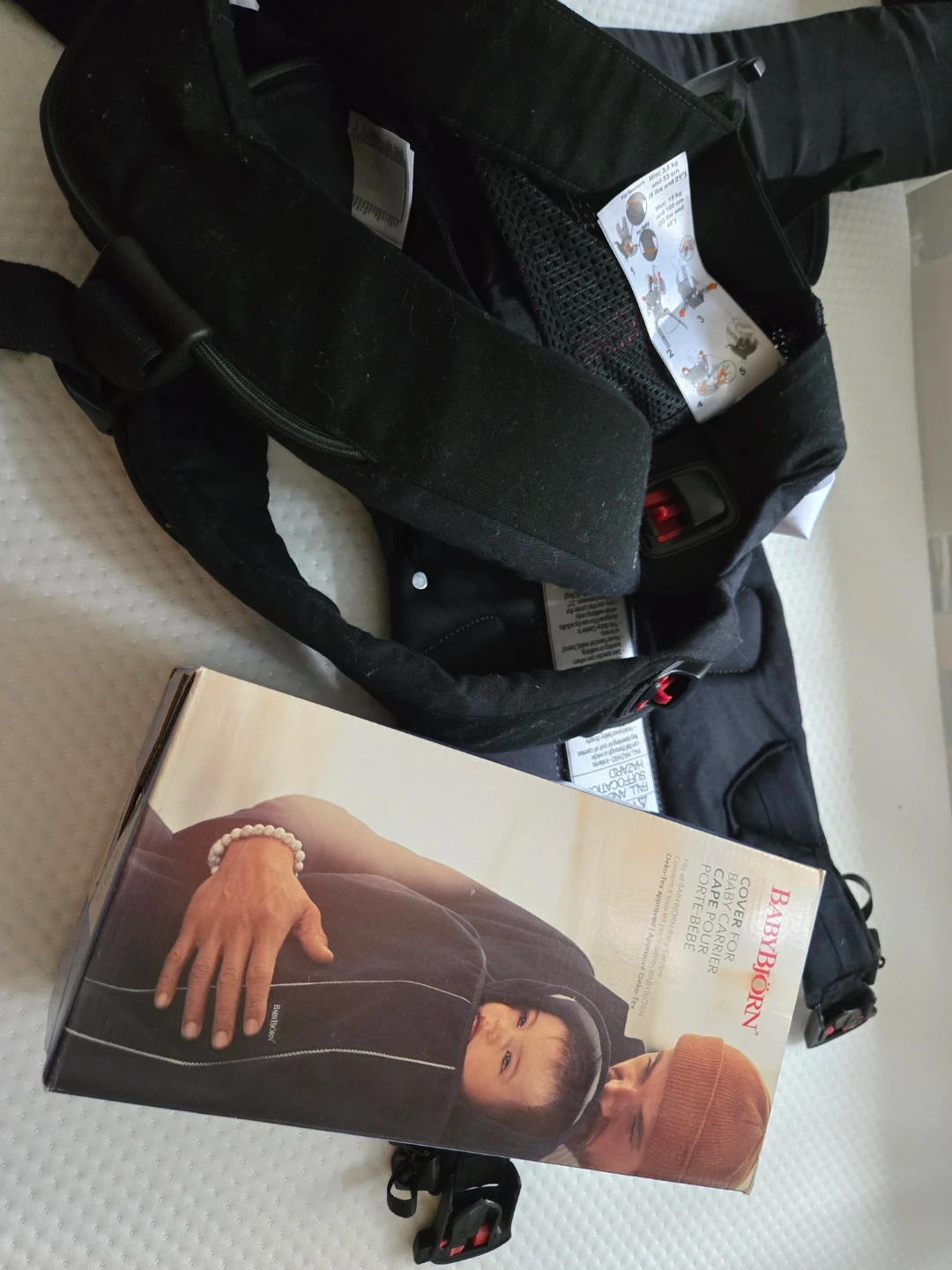 Selling a BabyBjorn One baby carrier in black! Babybjorn very good condition comes with add ons cover and changeable bibs. Never opened the box had 3 carriers so this is fairly new.