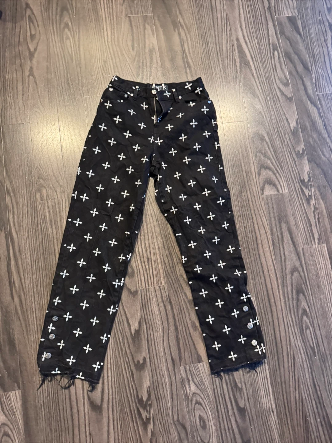 10Selling a pair of SMFK jeans in black with a white cross pattern. They're made of 100% cotton and have a stylish design. Perfect for adding a unique touch to your wardrobe! Size:M