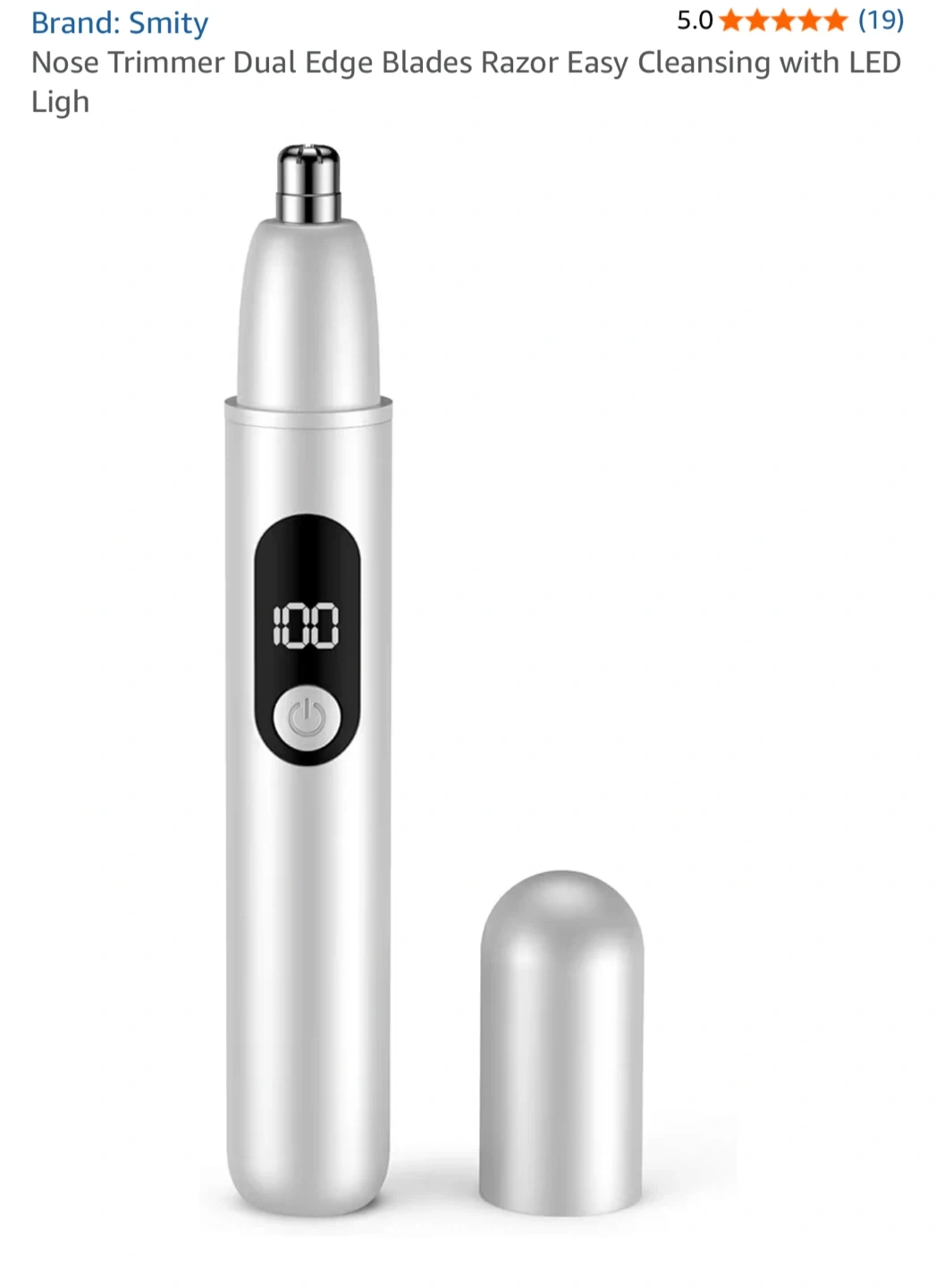 I'm selling a Smity nose trimmer featuring dual edge blades for easy cleansing. It also has an LED light to help you see better. Great for personal grooming!