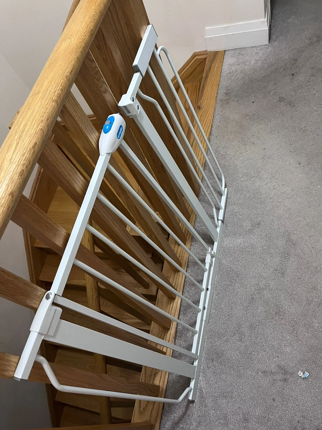 White metal stair gate. Features a pressure-fit system for easy installation. Ideal for keeping little ones safe at the top or bottom of stairs.