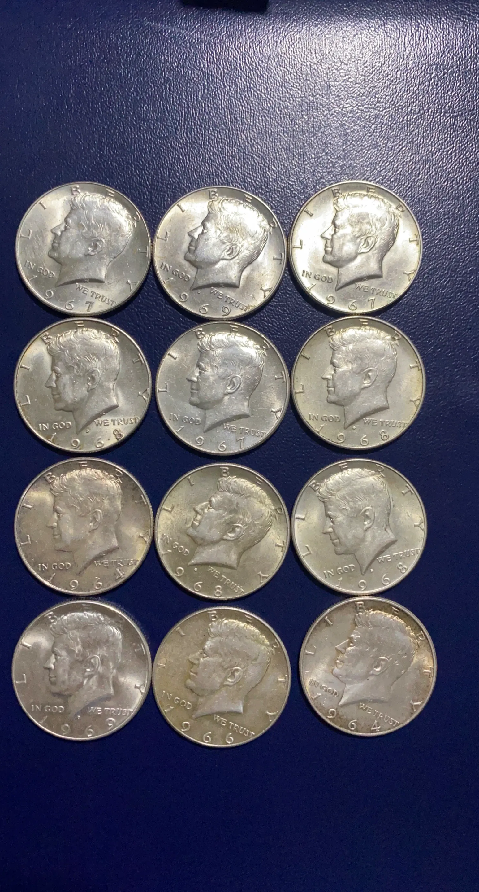This is a collection of 12 silver Kennedy half dollar coins. The coins feature John F. Kennedy on the obverse and the Presidential Seal on the reverse. Dates vary, with several from the 1960s visible. They are all 50 cent pieces.