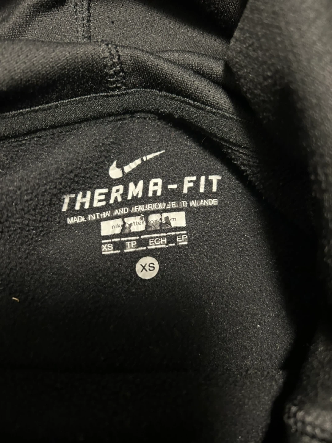 This is a black Nike Therma-FIT hoodie. It's a size XS and features the iconic Nike swoosh with a patterned fill. Made for comfort and warmth!
