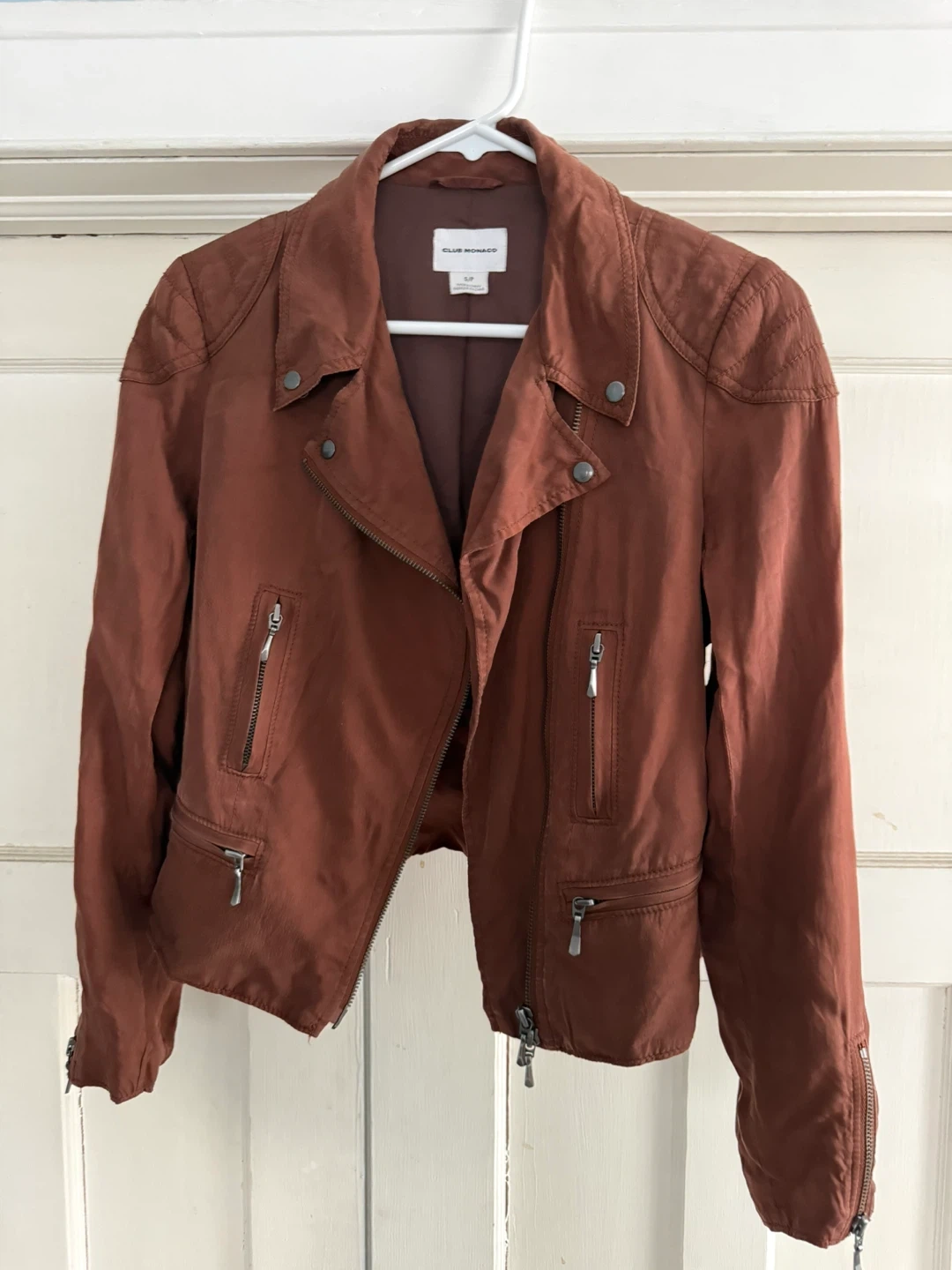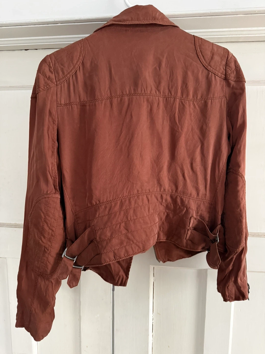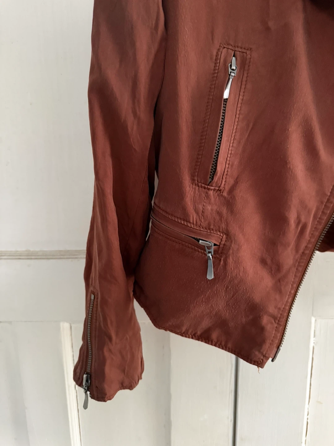 Stylish reddish brown biker jacket with zippers and buckles details. Size small but fits xsmall better :)