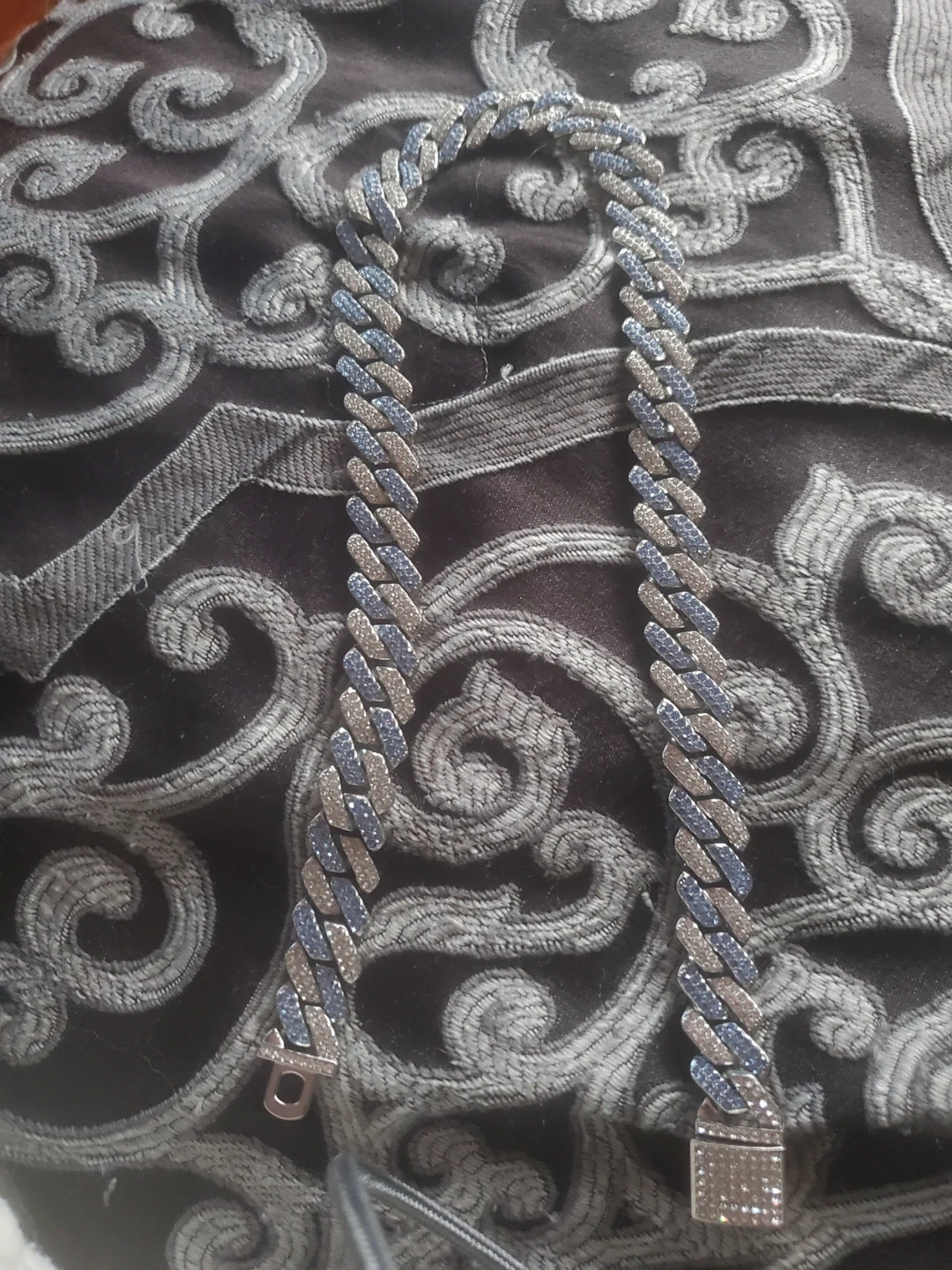 Sparkly Cuban link chain necklace with blue and silver accents. It has a secure clasp closure. Great for adding a bit of bling!