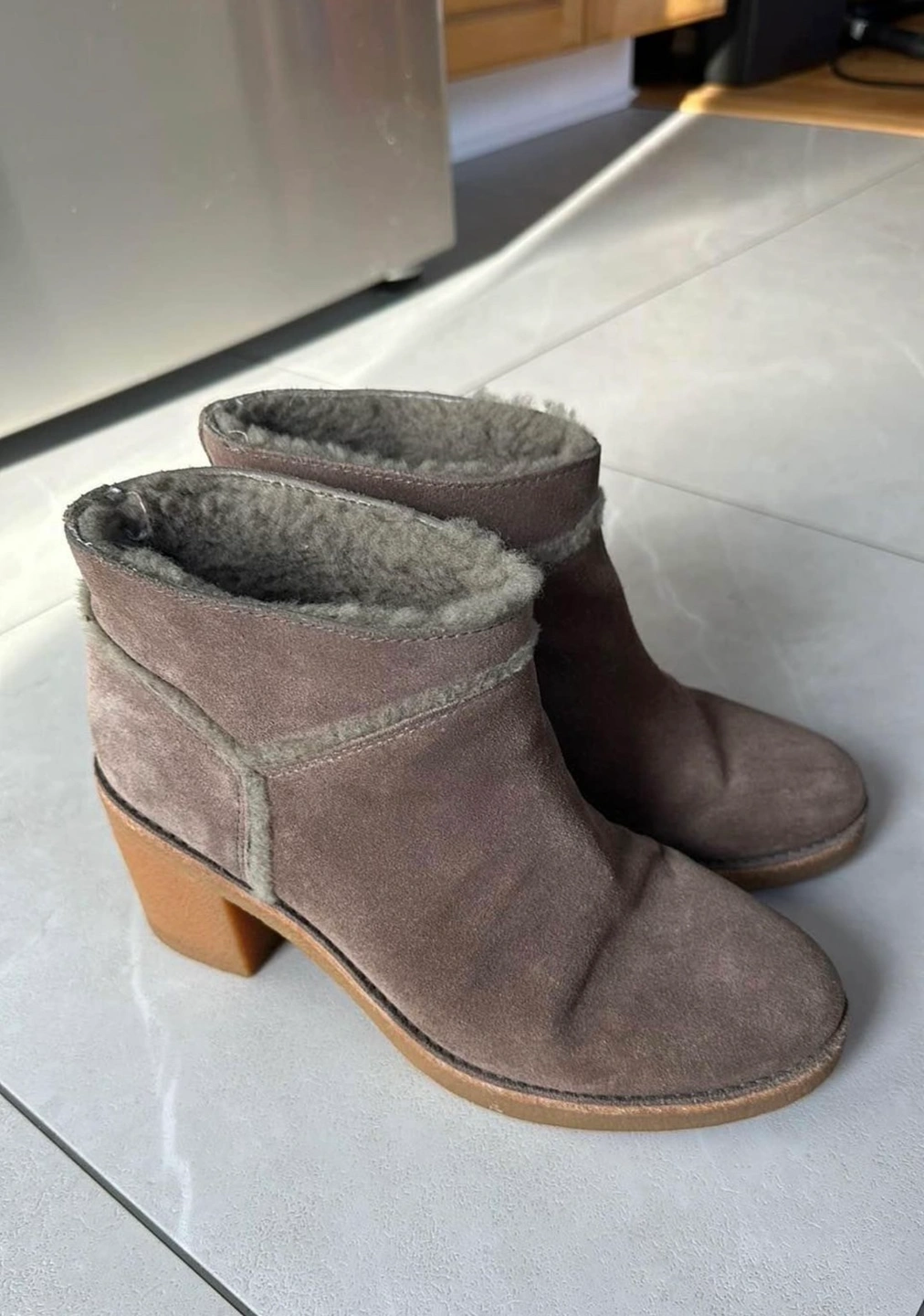 Grey suede ankle boots with a block heel and sheepskin lining. The boots are in excellent condition with minor signs of wear on heel. Please see photos for details.