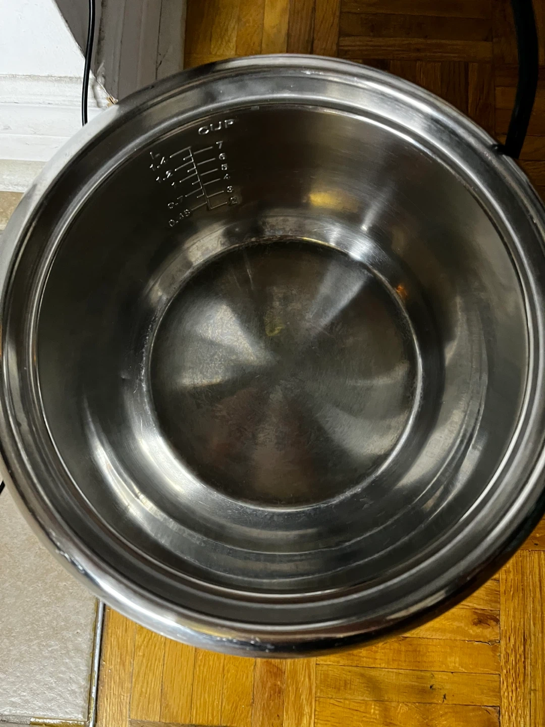š¤It features a stainless steel inner pot with clear L and CUP measurements.
