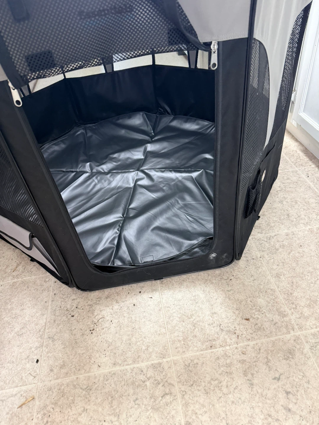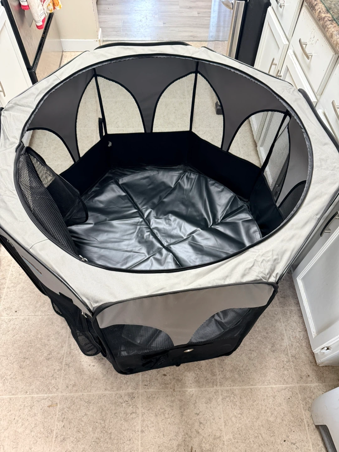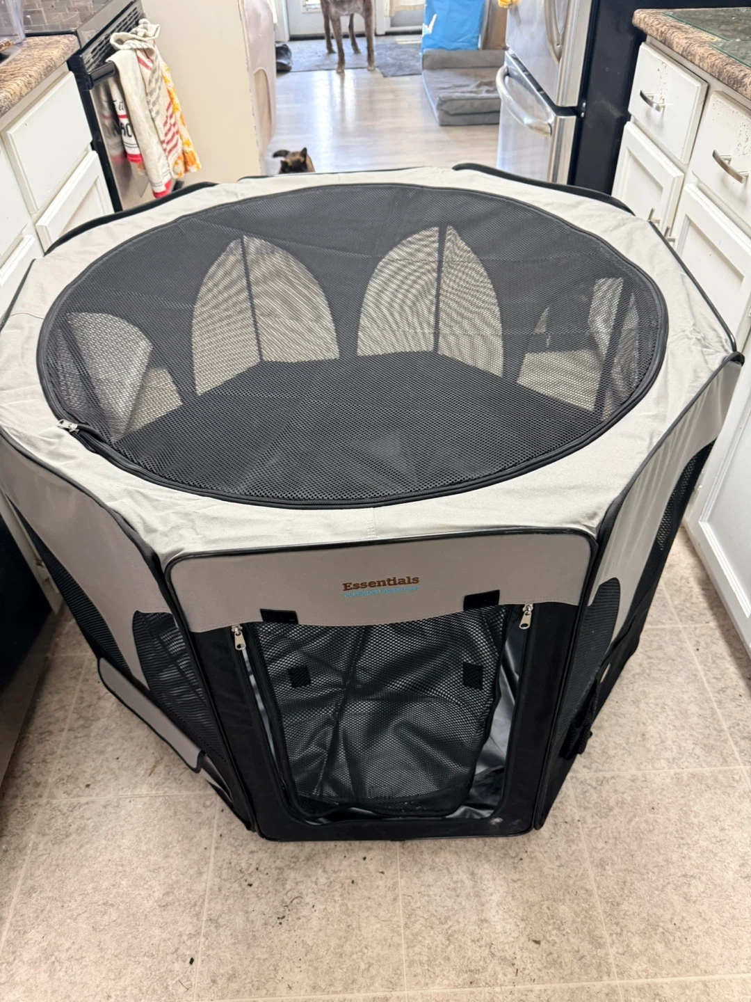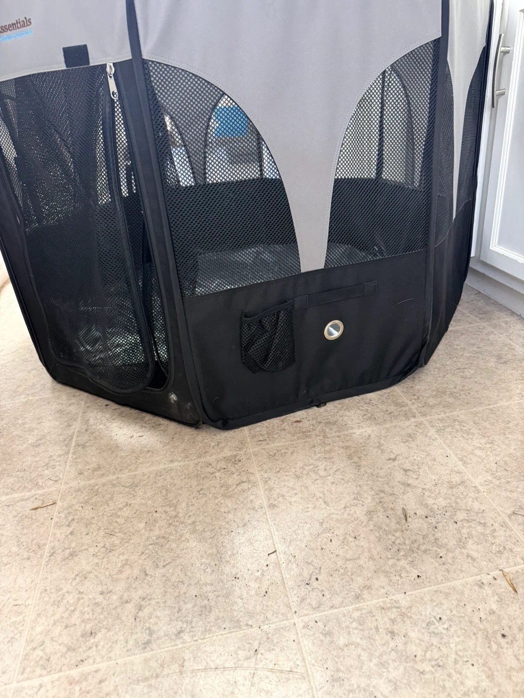 This Essentials pet playpen is great for travel and provides a safe space for your pet. It's made of durable materials with mesh panels for ventilation. Easy to set up and fold down.