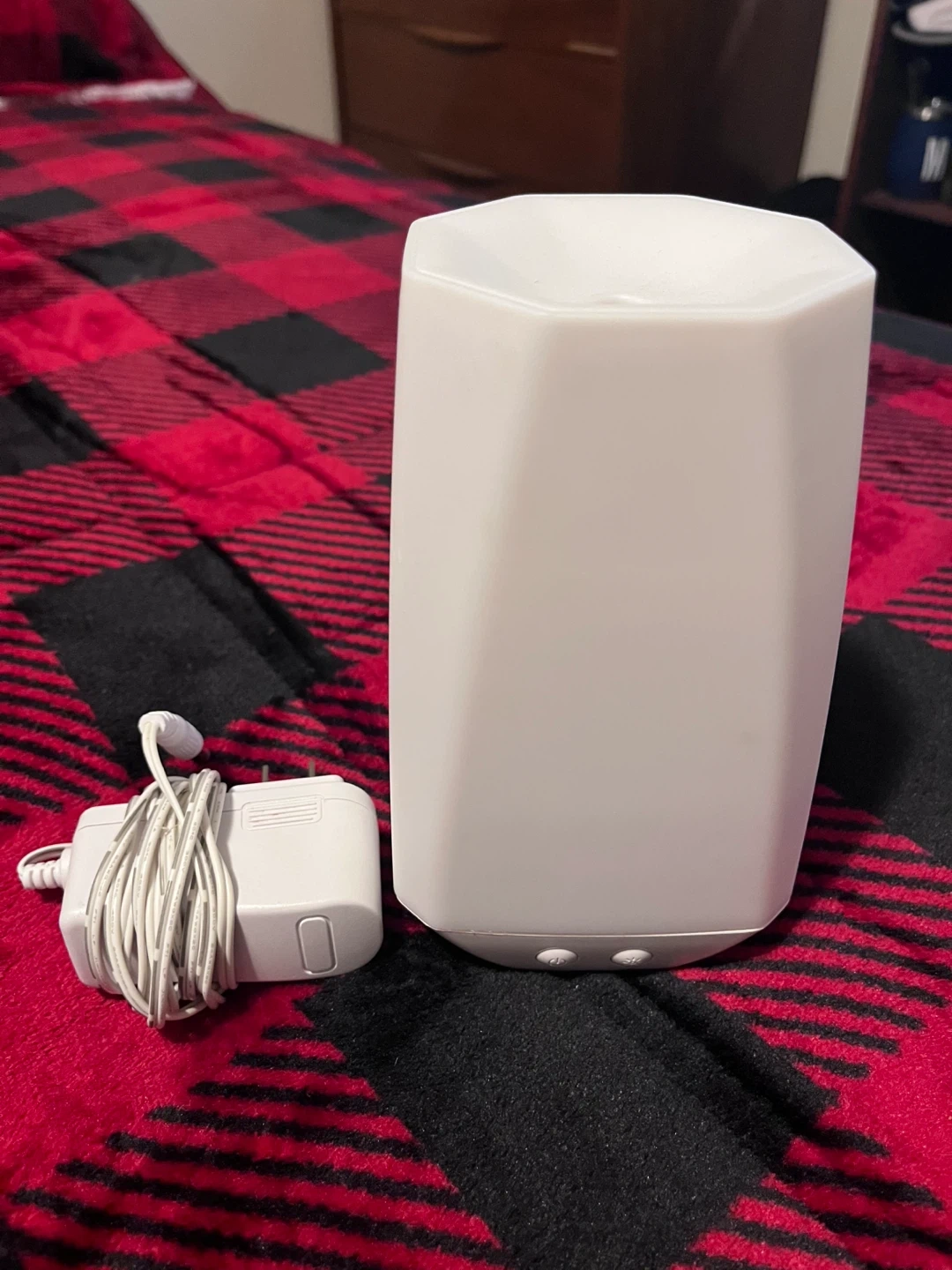 This white geometric aroma diffuser comes with its power adapter. Two small buttons are located on the front base. It's a white plastic unit. Great for creating a relaxing atmosphere in your home!