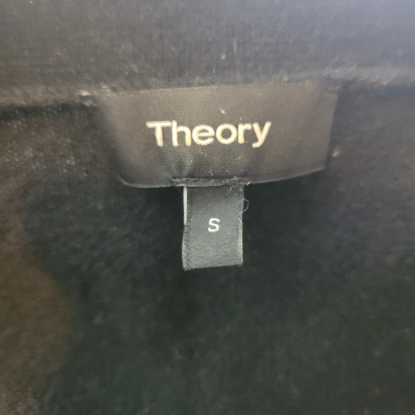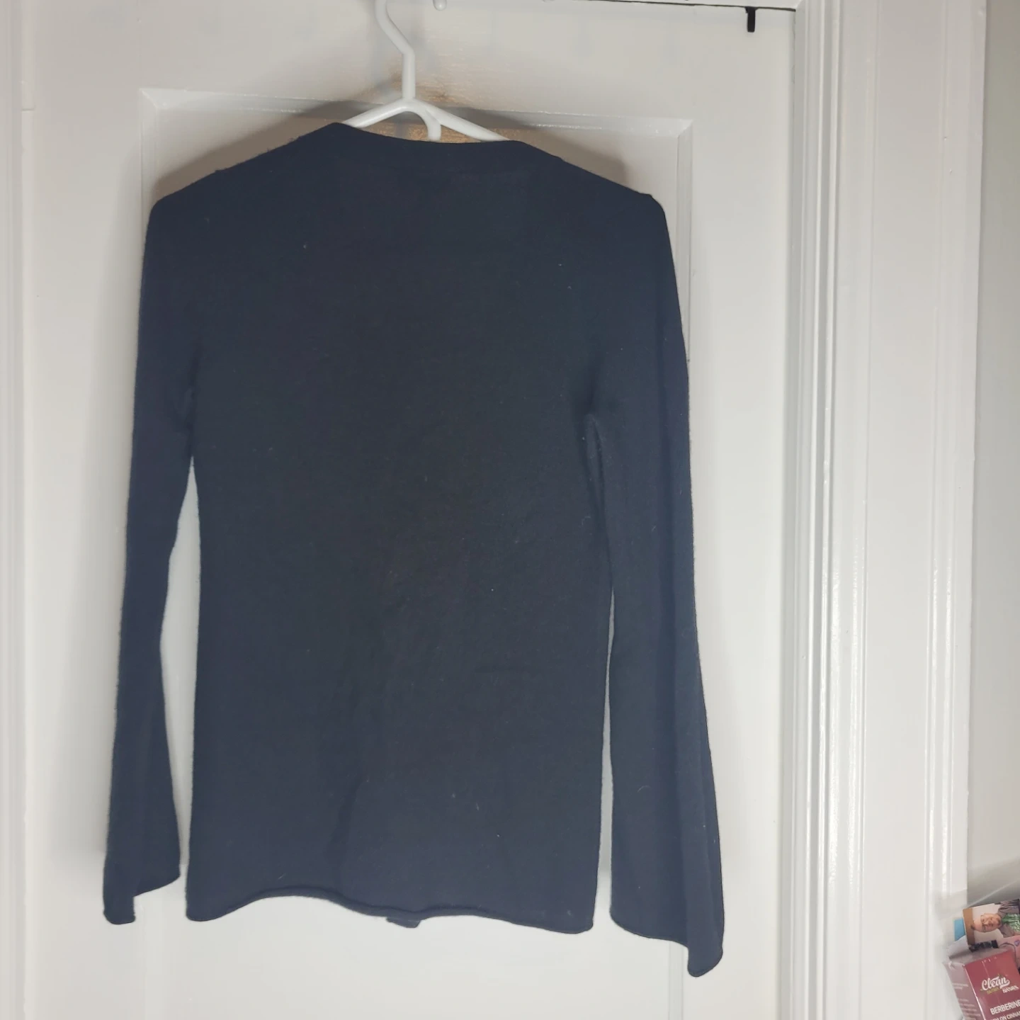 A Theory black cardigan made from 100% cashmere. It features bell sleeves and a button-up front. Size is small. Made in China. Dry clean only. Some pilling under arms.