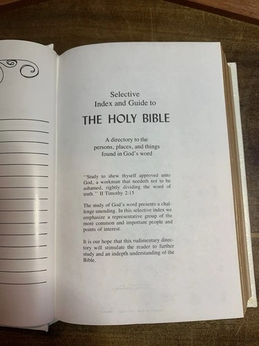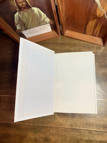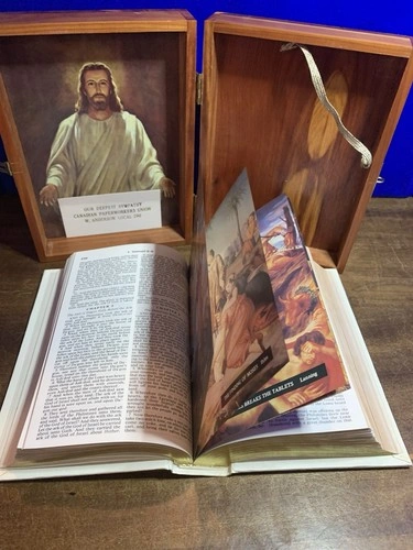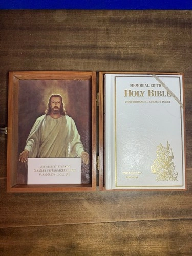 Offered for sale is a beautiful and distinctive Memorial Edition Holy Bible, Protestant Edition, complete with concordance and subject index, housed in a solid wooden presentation case featuring a hinged door with metal latch and a devotional image of Jesus Christ displayed inside. This is not just a Bible — it is a reverent keepsake and memorial piece, ideal for display, remembrance, and devotional use. The wooden case evokes the appearance of a small chapel or shrine, making it especially meaningful for home altars, prayer corners, memorials, or church settings. Inside the case, the Bible rests securely and includes illustrated devotional pages, ribbon marker, and study aids to support deeper engagement with Scripture. Key Features: Memorial Edition Holy Bible – Protestant Edition, Includes Concordance & Subject Index, Solid wooden presentation/display case, Hinged case with metal latch closure, Devotional image of Jesus Christ inside the case, Ribbon bookmark included, Illustrated devotional inserts and study materials. Condition: Very Good Pre-Owned Condition. Bible pages are clean and legible, Binding is intact and secure, No missing pages observed. Wooden case shows minor surface wear and small marks consistent with age and respectful use. Hinges and latch function properly. Please review all photos carefully — they show the exact item you will receive and form part of the description. Perfect For: Memorial or remembrance gifts, Home prayer or devotional spaces, Church offices or chapels, Christian collectors, Sympathy or bereavement gifts, Confirmation, baptism, or family keepsake. This style of wood-cased Memorial Bible is increasingly difficult to find and is highly appreciated for its symbolic, devotional, and display value. A meaningful and dignified piece that blends faith, craftsmanship, and remembrance.