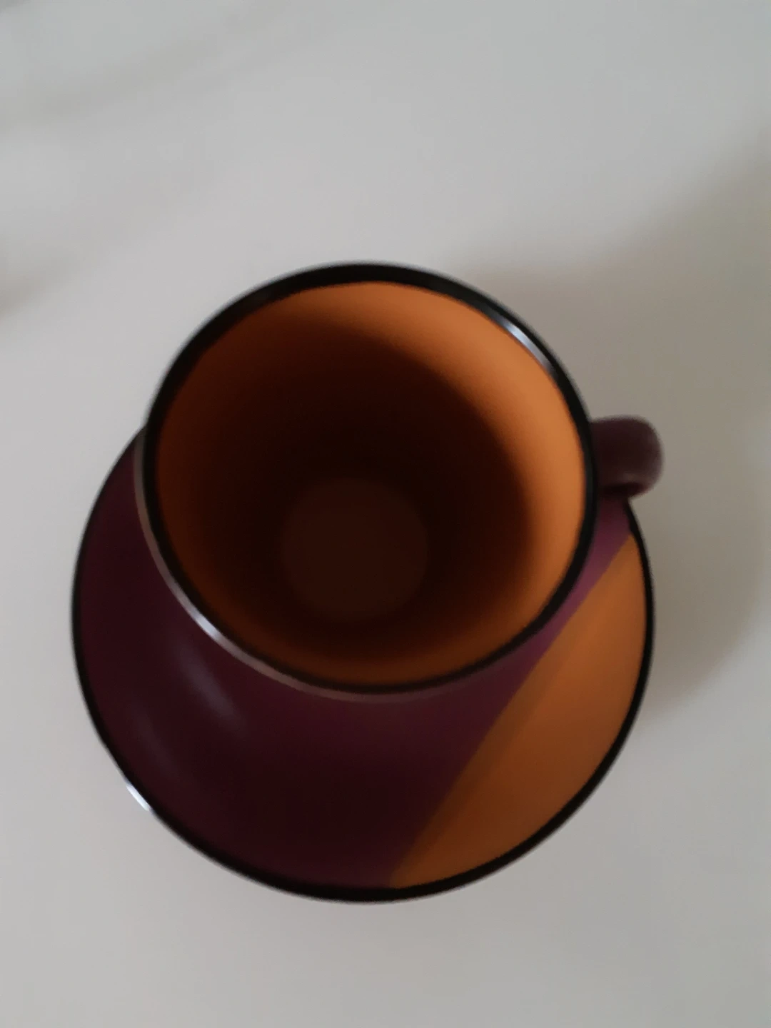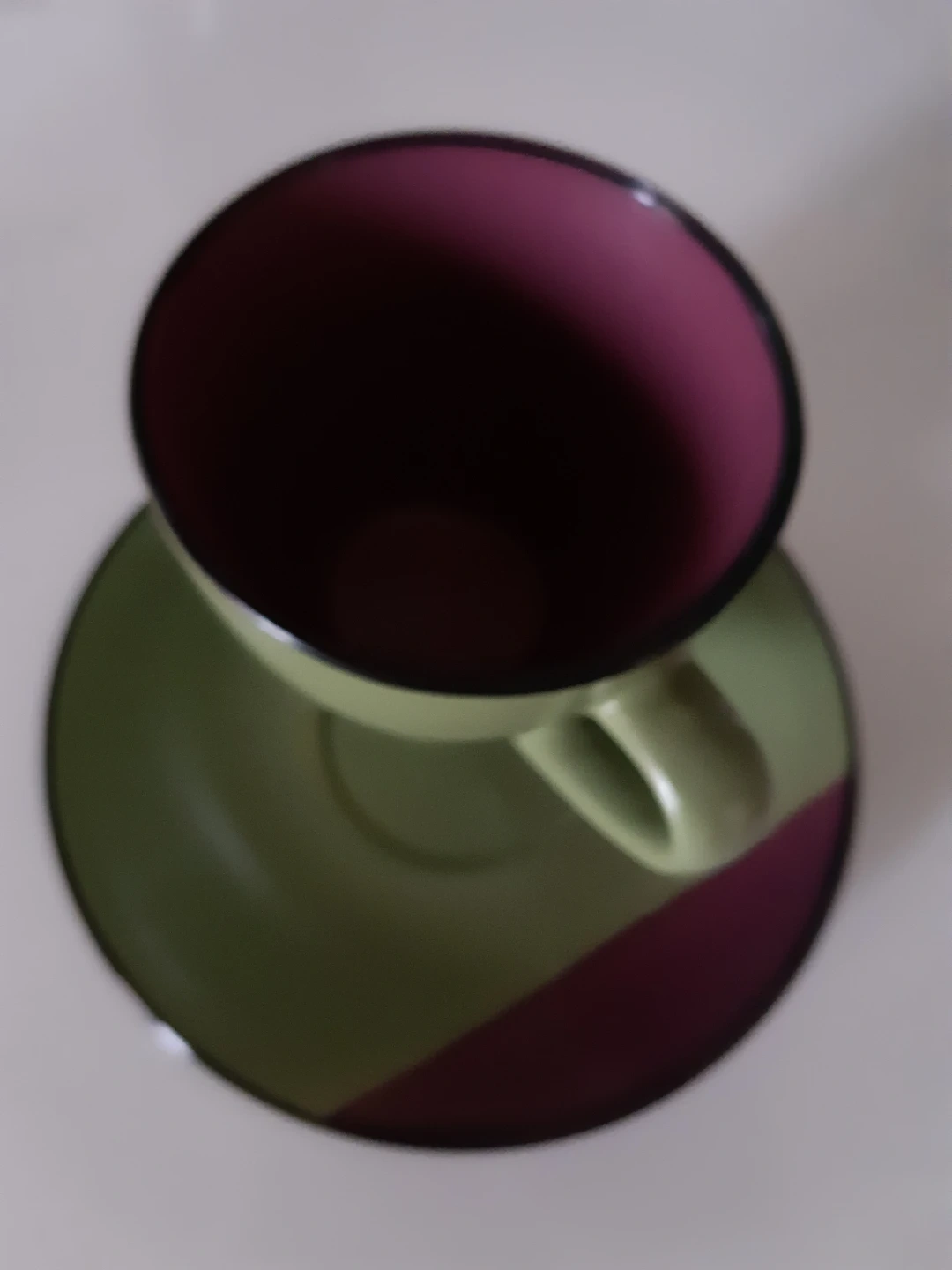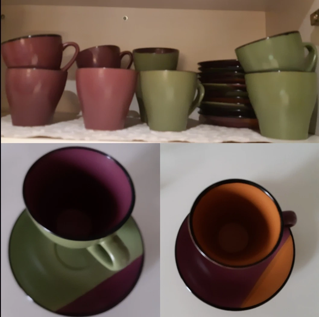This very high quality of set of 20 coffee or tea cups and matching saucers come in two colours 10 pcs, plum and 10 pcs sage green, with black rims The saucers are plum-coloured with a black rim. Made of ceramic. Perfect for your morning coffee or afternoon tea!