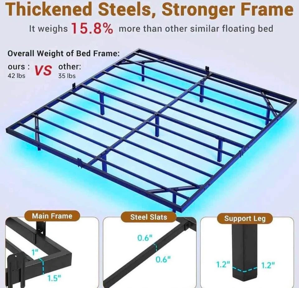 Brand New in Box. King size floating bed frame. Features a floating design for a unique look, supported by internal legs for stability. Includes a multi-color LED light strip with music sync and timer, controlled by remote or app. Also has a built-in charging station with 2 AC outlets and 2 USB ports. Designed for silent and stable use with mattress stoppers and anti-slip pads. Made of durable metal with 11 slats for mattress support. Assembly is straightforward with clear instructions.