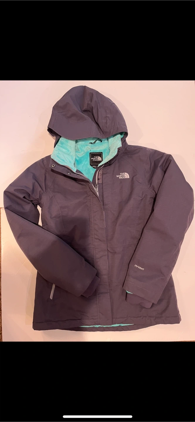 This is The North Face HyVent jacket in grey with a teal lining. It's designed for warmth and protection from the elements. The jacket has a hood and durable HyVent technology. Medium size for women’s.