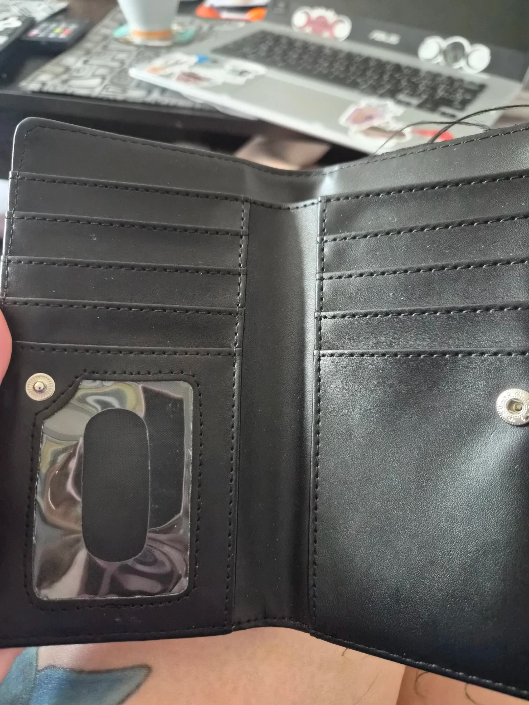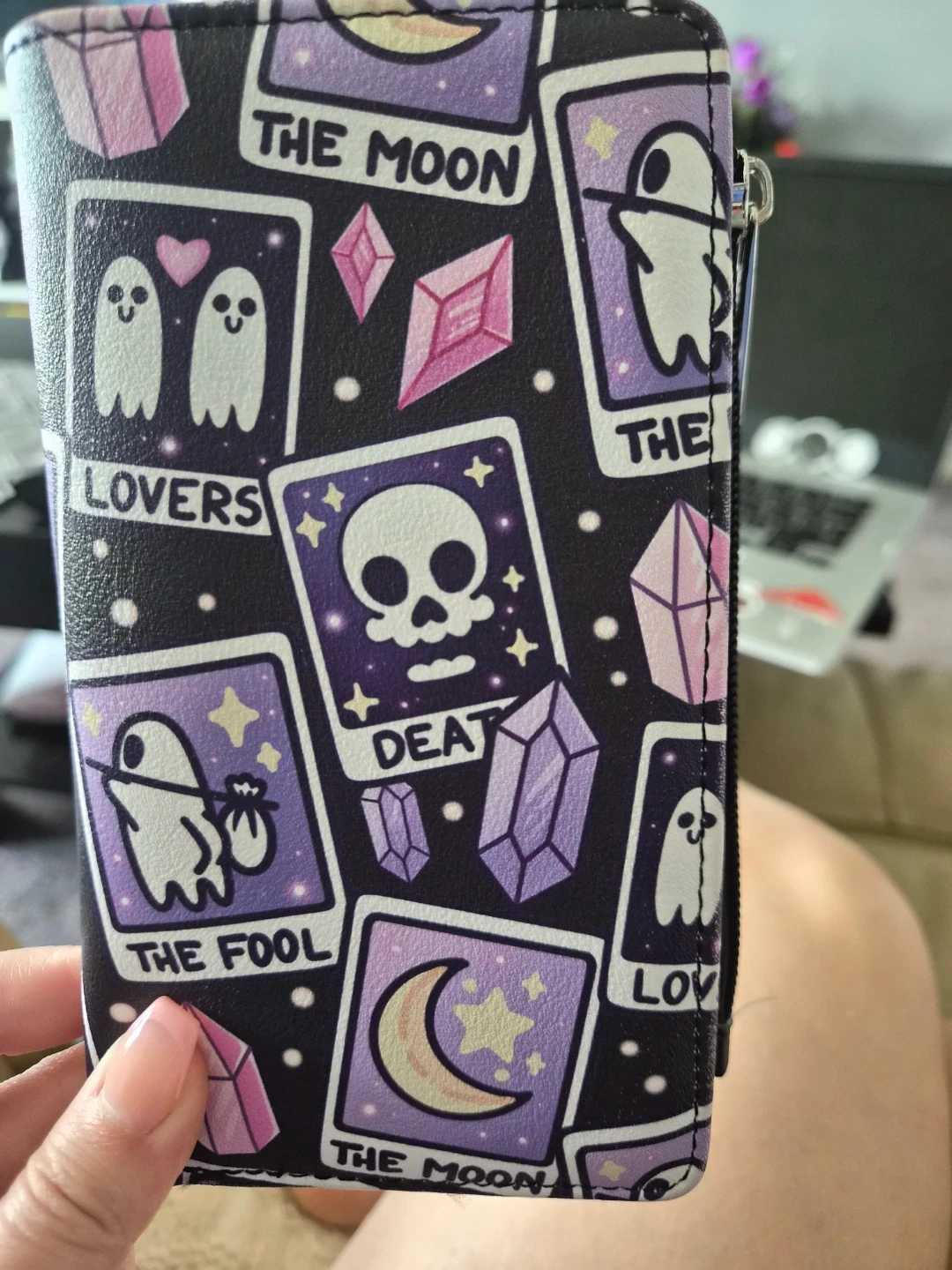 This wallet has a fun tarot card design with ghosts and crystals. It's black with a zippered closure and multiple card slots inside. Perfect for keeping your essentials organized!