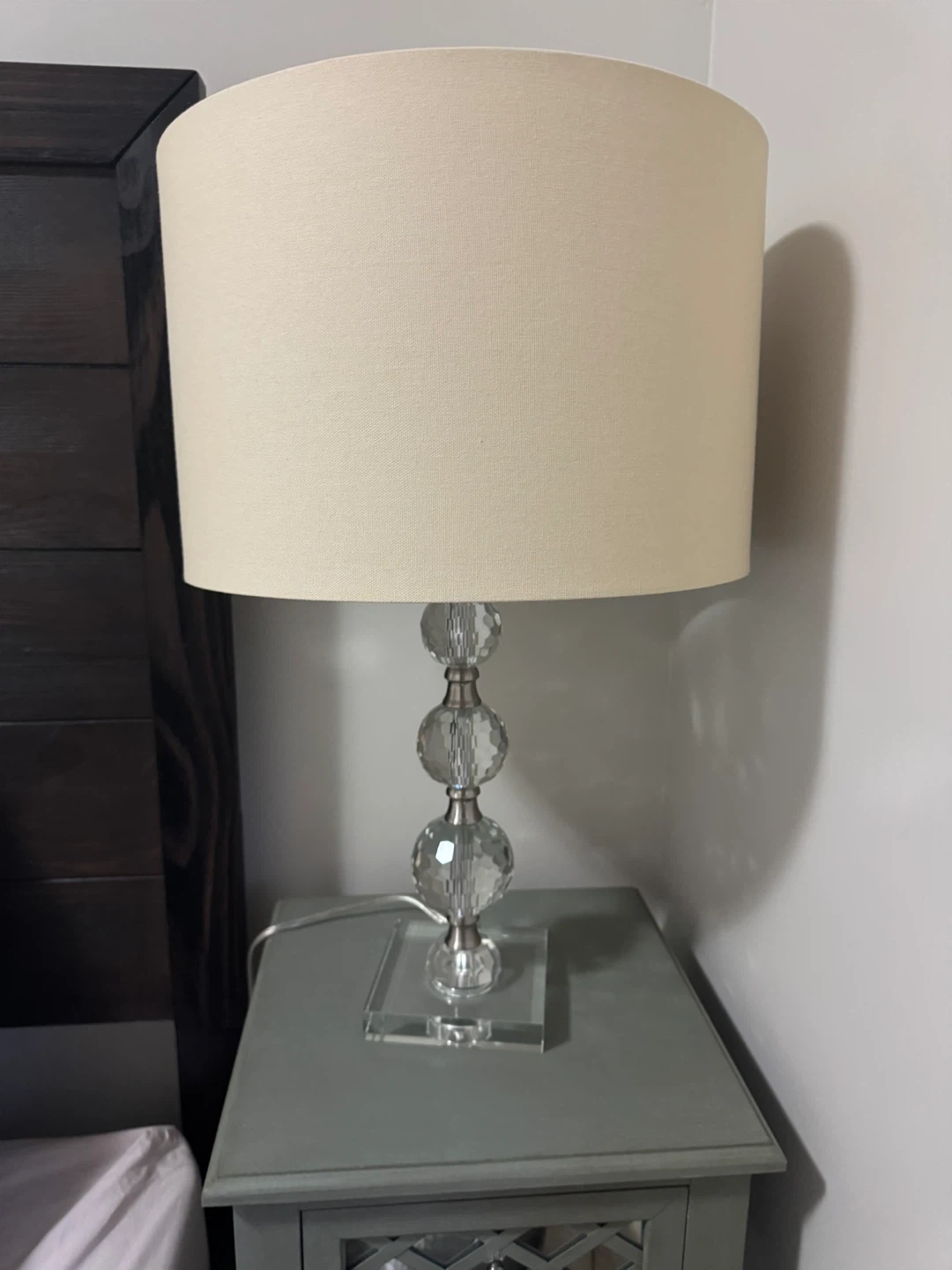 Selling a table lamp with a crystal ball design. It has a beige lampshade and a clear crystal base. It would look great on a bedside table or desk!