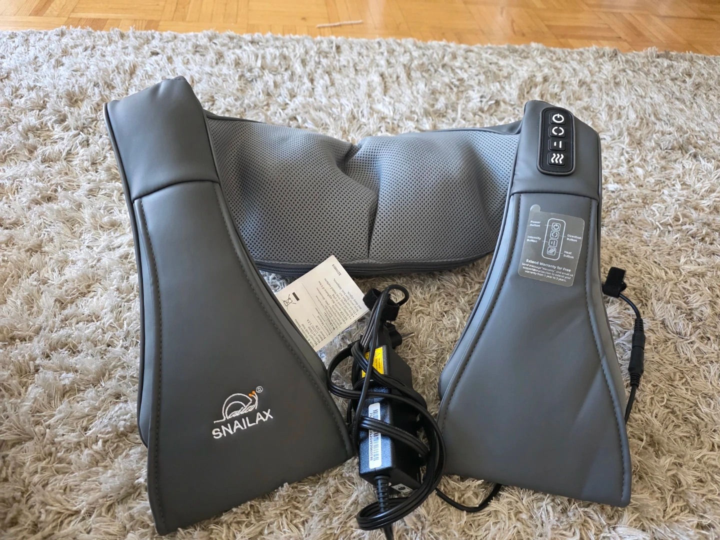 17This Snailax Shiatsu Neck & Shoulder Massager is perfect for relaxing after a long day! It comes with the charger. It has intensity and direction buttons, as well as a heat function. Get ready to unwind and relieve those tense muscles!
