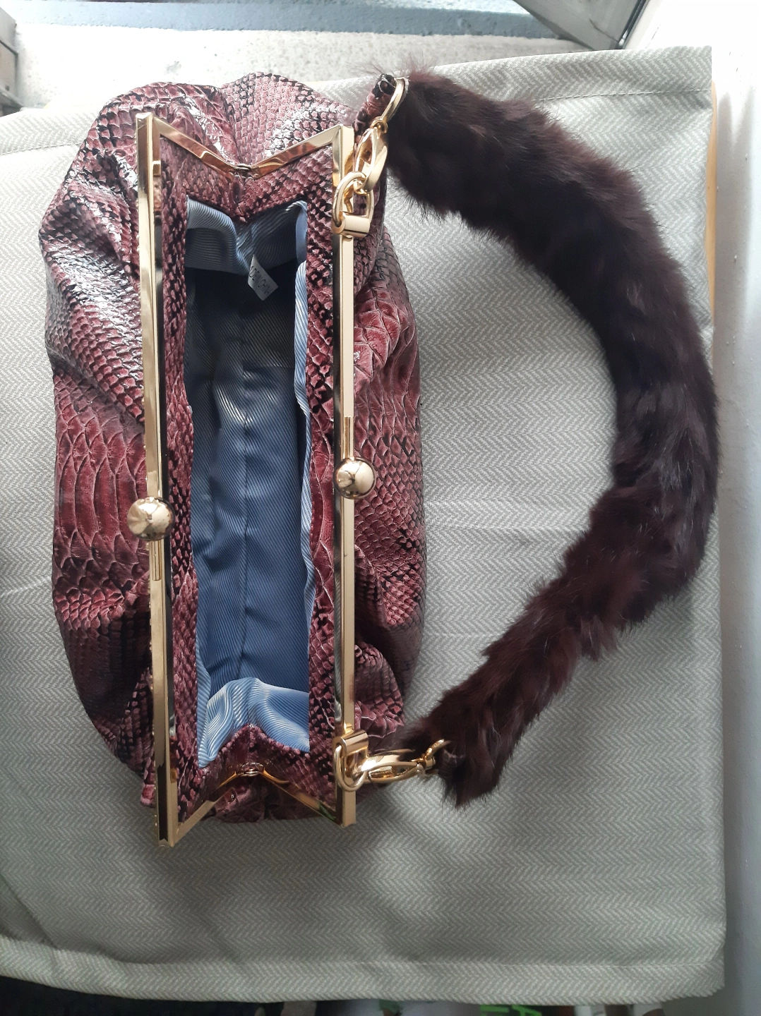 60Unique handbag featuring snakeskin and fur accents! It has a gold-tone frame and clasp, with a blue striped lining inside. Perfect for adding a touch of elegance to your outfit