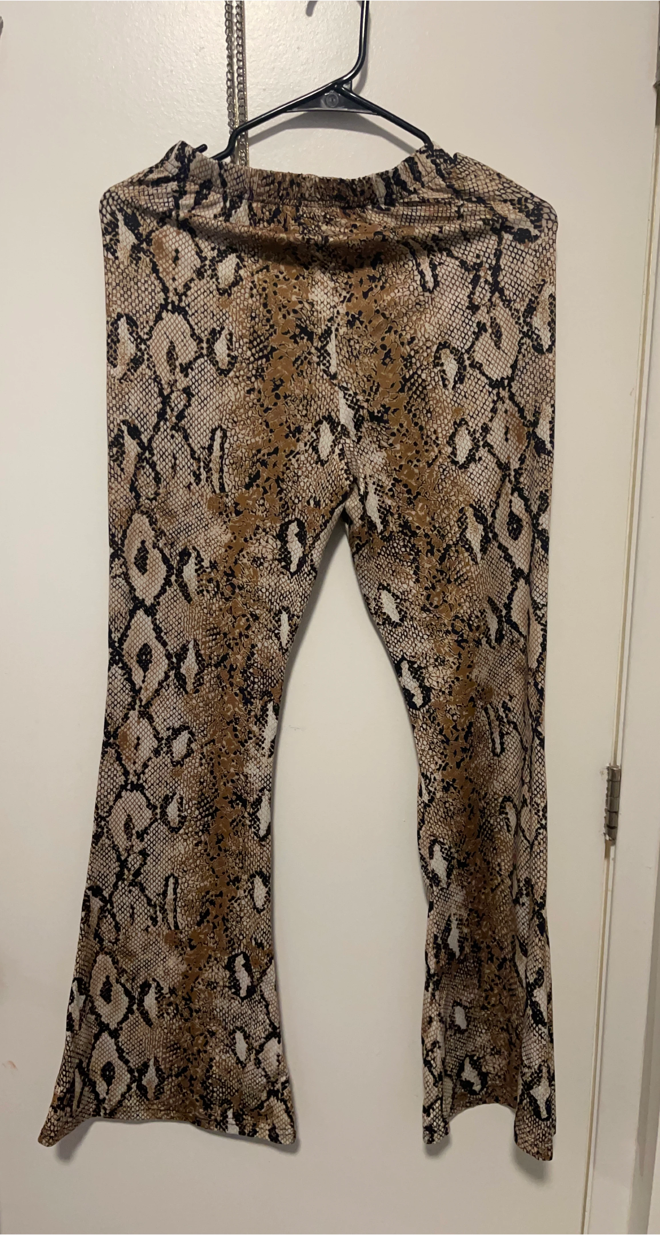 97Snakeskin print flare pants, perfect for adding a bit of flair to your wardrobe! These pants are in great condition and ready for a new home. They feature an elastic waistband for a comfy fit.